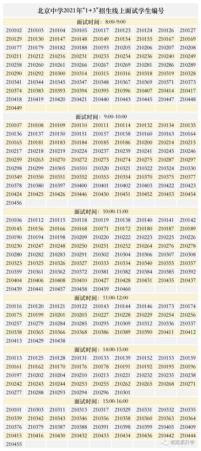 2020年和2021年由于疫情影响是通过线上面试,从面试名单和最终录取名单对比来看,北中将小五班的学生基本上都安排在下午面试,外校学生280个左右在上午面试,小五班的80个学生(实际录取名单显示79个)基本上都是自动录取。 外校录取大约40人。关于面试内容和形式请大家自行网上查询,往年没有疫情的时候面试会有群面,而且有逻辑题和陈述等,近几年应该还是多以学科题目为主了。最后是在7月27号通知的录取。2021年录取的1+3的学生基本上都是朝阳头部初中校的年级前几名,人朝,人朝分占很大比重,嘉铭,帝景,管分,陈分,朝外等头部初中都有学生入选。 关于北京中学1+3项目的细节参见2021届的北中1+3实力有多强?