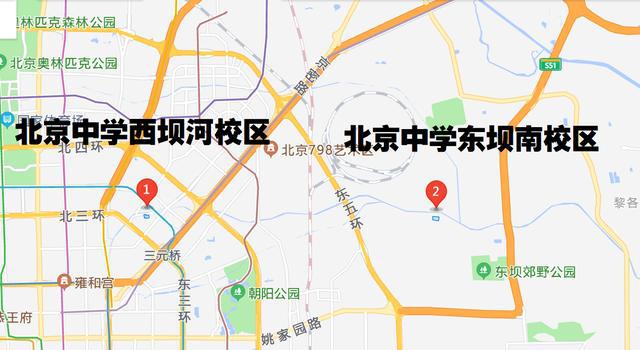 北京中学目前主要有两个校区,西坝河校区和东坝南校区,西坝河校区主要是小五班的实验班,有6,7,8年级的小五学生,东坝南有小学1,2,3,初中7,8,9以及所有的小五班和1+3的学生升入初三以后组成的高中三个年级,他们都会从西坝河搬到东坝继续高中学习。