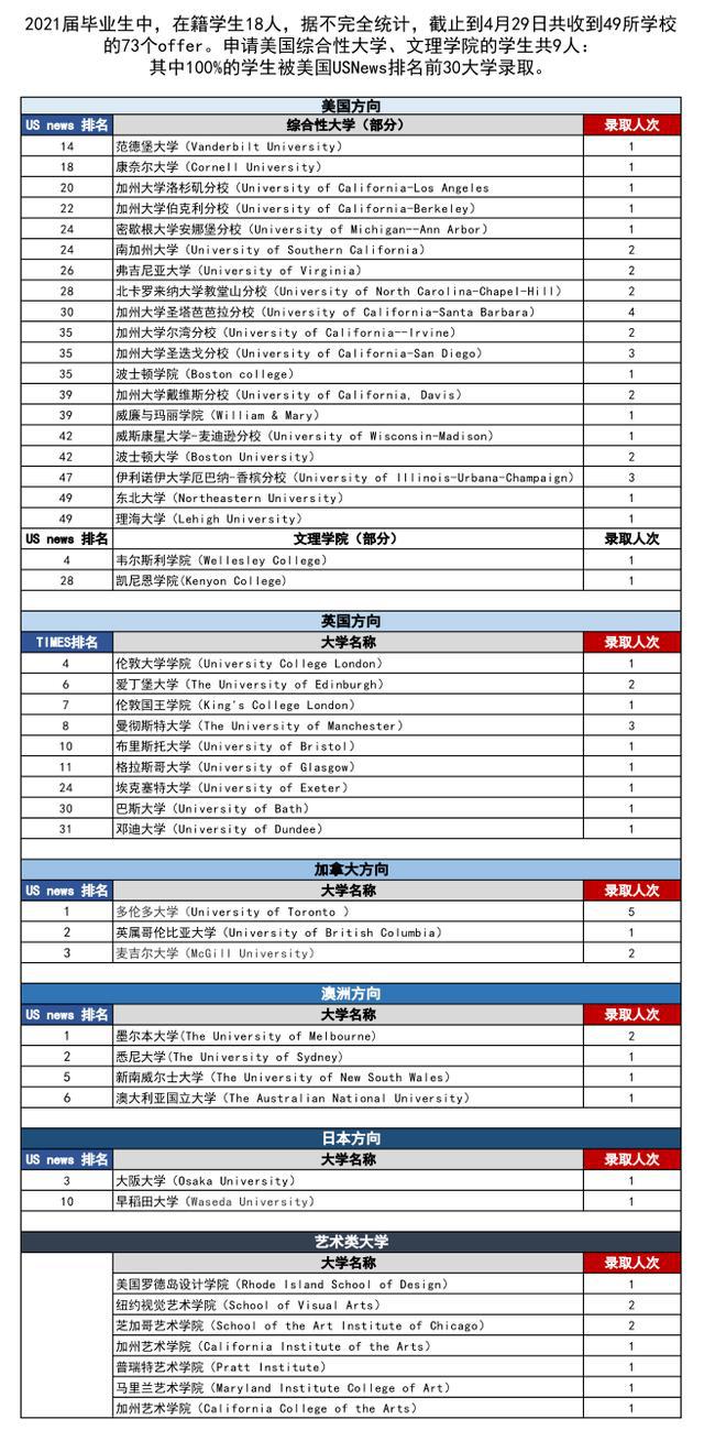北京中学国际方向班级在2017年组建,2020年迎来了首届毕业生。虽然仅有28人申请国外大学,但是他们收获了6个国家、75所世界知名大学的130个offer,其中包括了哈佛、斯坦福、宾大等世界名校。