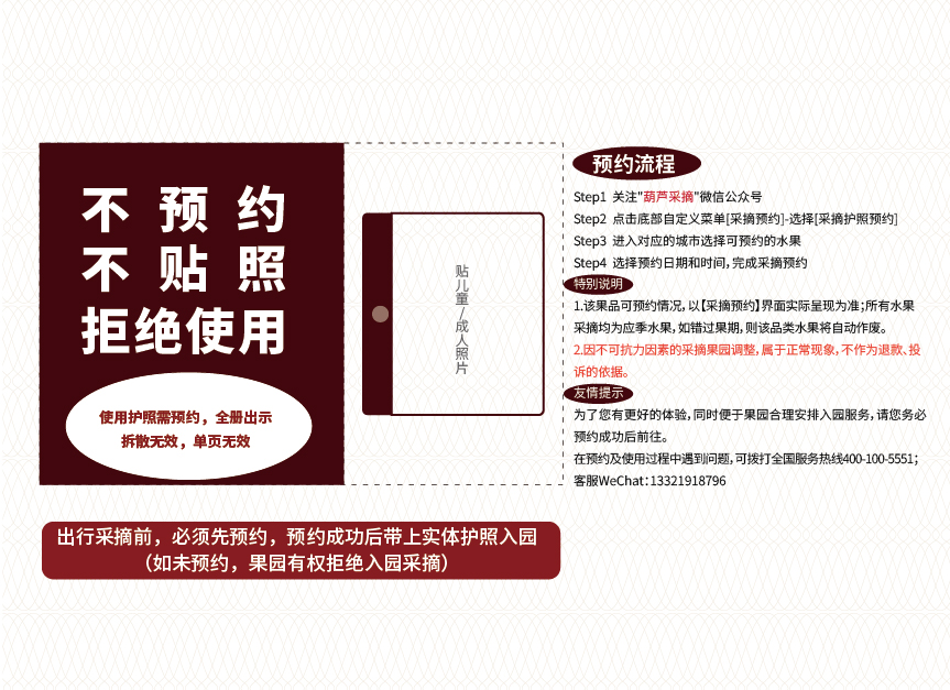 《水果采摘亲子护照》需粘贴儿童一寸证件照片,使用时必须出示全册,拆散、单页、无证件照片、无防伪码均无法使用,请自行妥善保管,遗失不补。