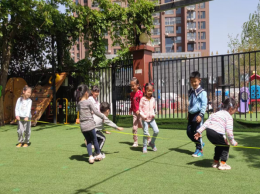 三块绿茵草坪构建起孩子们恣意奔跑的活动场地,不论是寒风料峭的冬日还是烈日炎炎的夏季,孩子们都能够让自己的身体在上下午各一小时的户外活动中得到充分的锻炼。户外活动由韵律体操、阳光体能、灌篮高手、跳绳能手和有趣的体育游戏组成,这些活动不仅发展了孩子们的大动作,还提升了孩子们的应变能力和不怕困难的意志品质,也使得教学主题更加鲜活生动,层次分明。