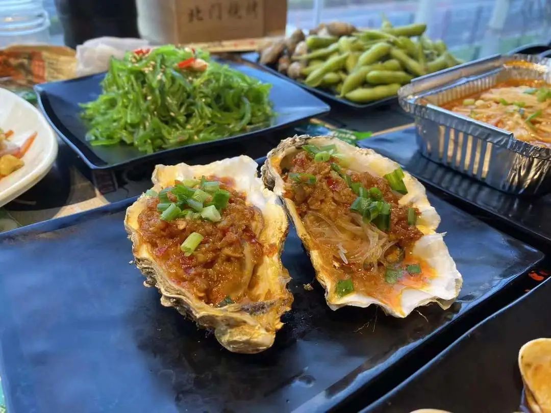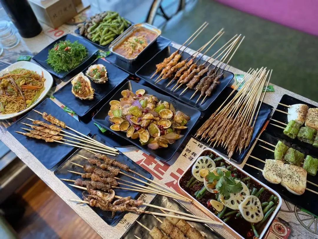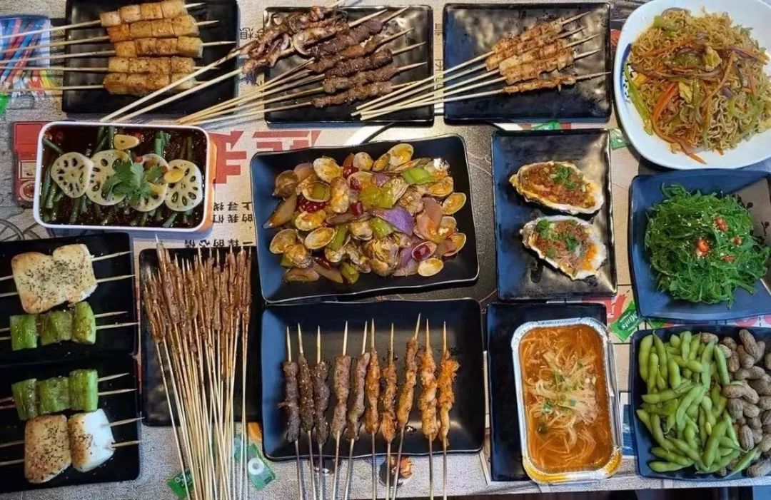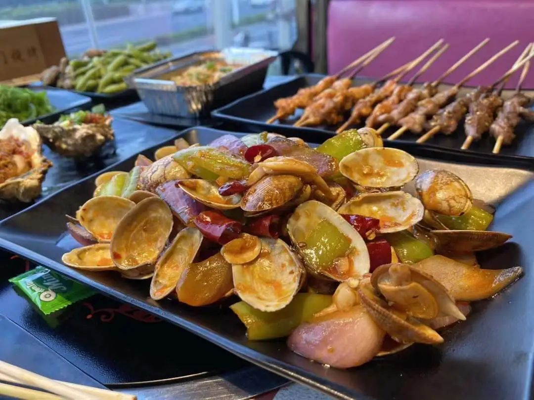 辣炒花蛤 1份碳烤生蚝 1份 烧烤:羊肉串 5串牛肉串 5串 鸡肉串 5串 牛板筋 5串 烤尖椒 2串烤鱿鱼须 2串 手把鸭肠 1份 鱼豆腐 1串凉菜:捞汁素拼 1份凉拌裙带菜 1份 花生拼毛豆 1份锡纸类:锡纸金针菇 1份 主食:炒方便面 1份烤馒头片 2份