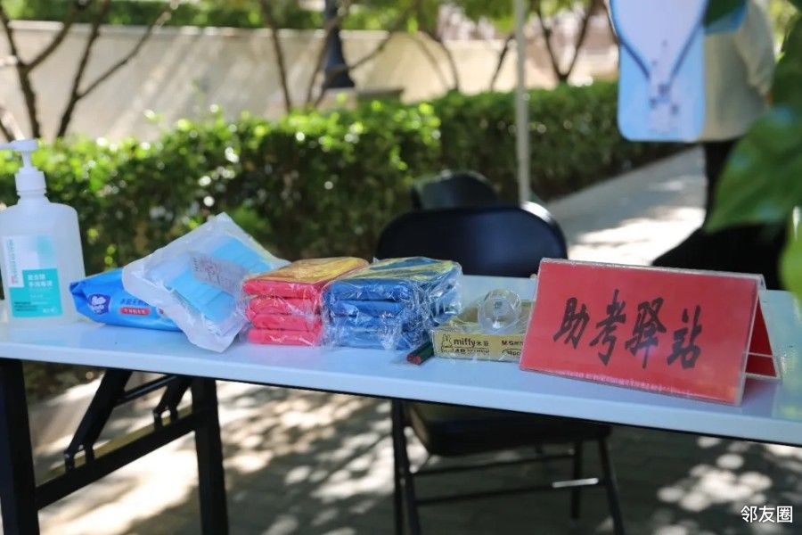 考场外,街道设立了“助考驿站”,为考生及家长贴心准备了应急药品、免洗消毒液、口罩、坐垫和考试文具等,以备不时之需。