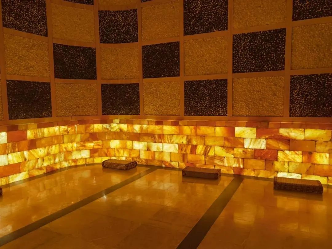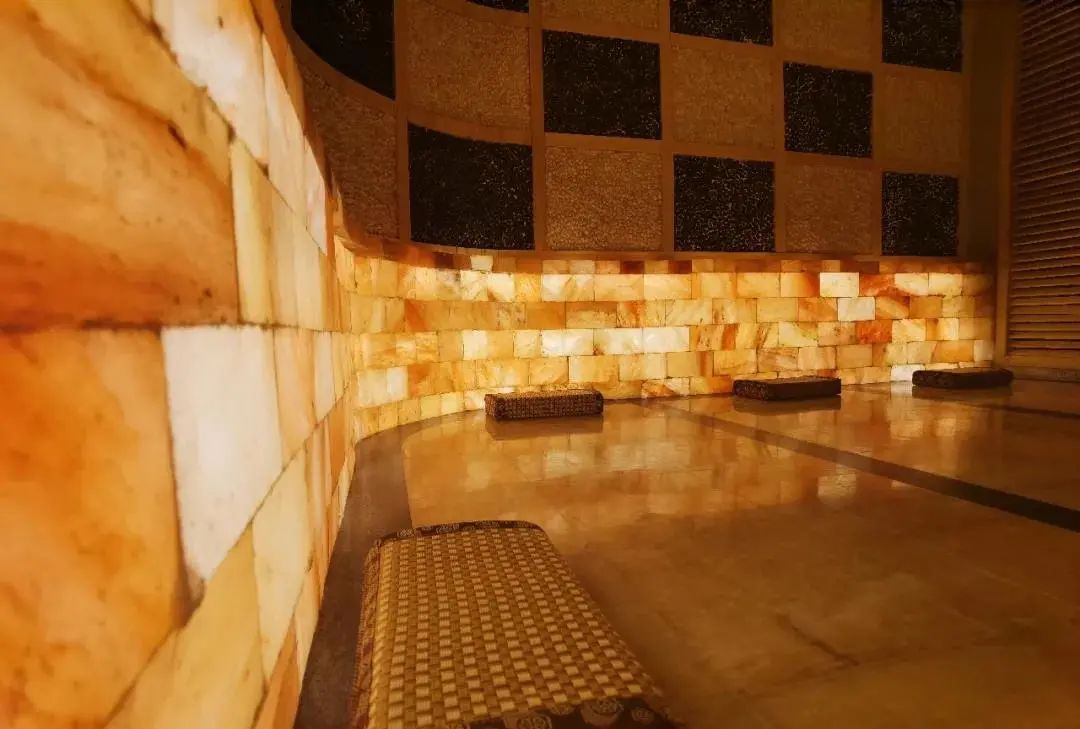 盐房可以释放大量负离子还可以释放人体所需的微量元素虽然汗蒸好处多多但还是要提醒大家时间不宜太久微微出汗即可哦~