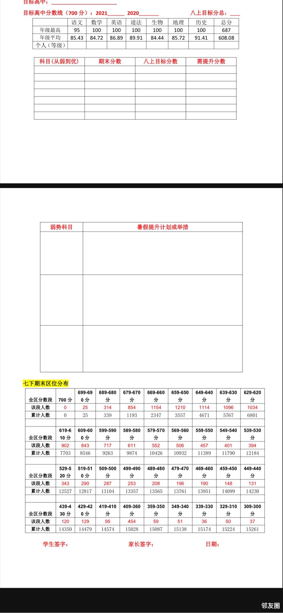 老师就跟孩子们说了多少分数在校排名的分数段,100、200、300的,让自己琢磨努力,你们这个区的还挺费心思,比自己猜强,给孩子们敲警钟呢