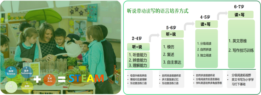 国际班外教全天8小时驻班设置,创建全英文浸入式的学习生活环境,外教老师管“全套”,从教学计划、策划活动、一对一家长会都以外教担当,外教带来的除了语言,还有多元开放、包容尊重、独立创新的思维。