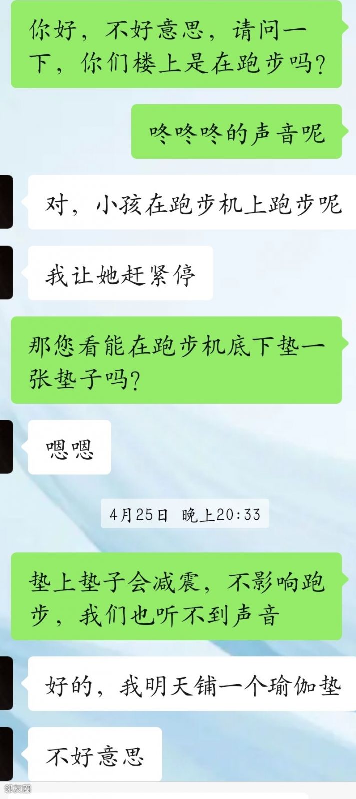 我的跑步机垫了八公分的垫子,其实基本快走,没怎么跑过,跟楼下认识跟他打了招呼,有声音随时找我