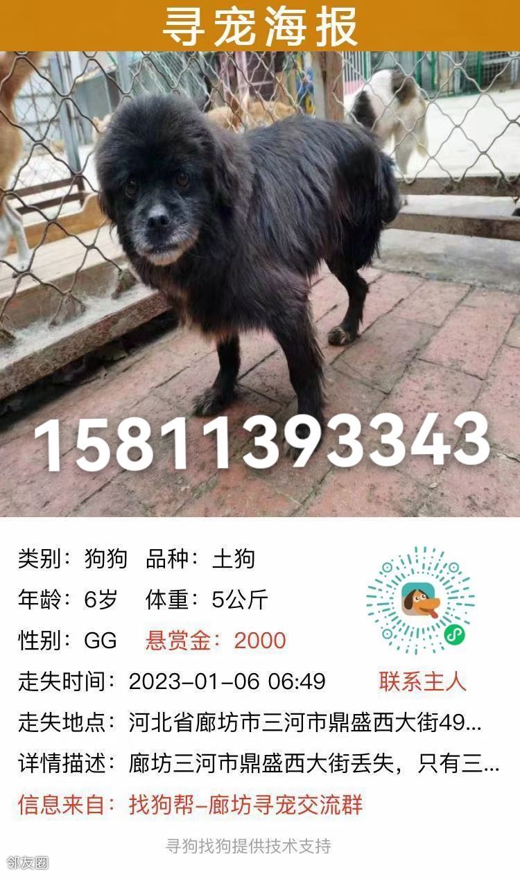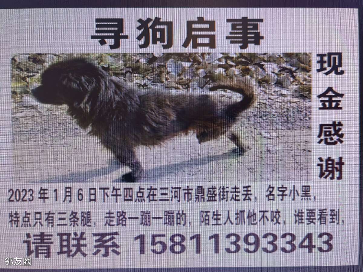 3000元寻狗,廊坊三河市1月6日下午5点丢失一只三条腿残疾小黑(普通狗),我已经不合眼找了三天三夜,麻烦大家帮忙转发,不管谁找到,我一定给钱,大家可以把我电话删除,留自己的然后转发各个群和朋友圈,不管谁找到我就给钱!跪谢,15811393343