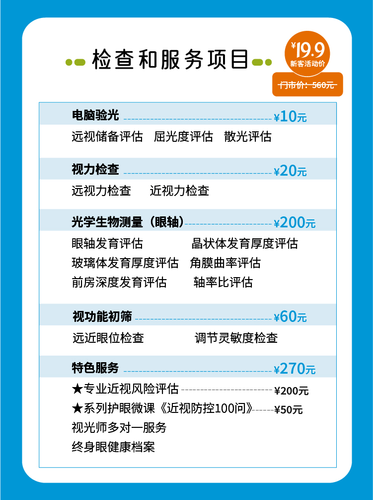 【项目内容】电脑验光、视力检查、光学生物测量(眼轴)、视功能初筛、特色服务等。