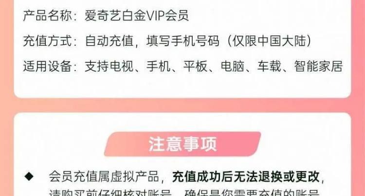 充值须知:1、默认下单手机号充值,下单请填写会员绑定的手机号,未绑定的请先绑定后再下单!2、订单提交后不可更改,账号错误责任自担,不退不换!3、如同一手机号绑定了多个会员账户,充值随机到账其中一个,会员到账后的会期转移问题请联系咨询官方客服!4、每笔订单限购1单,如需多充可分多次购买,会员时长自动叠加!