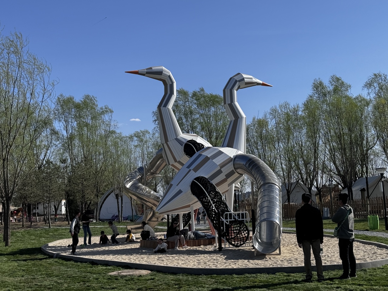 取材于苍鹭和白鹭等动物:将设施的形态取材于当地特有的苍鹭和白鹭等鸟类,不仅增加了游乐设施的趣味性,还展现了对自然生态的尊重。这种设计方式使孩子们更容易与自然建立链接,并激发了对当地生物多样性的兴趣。