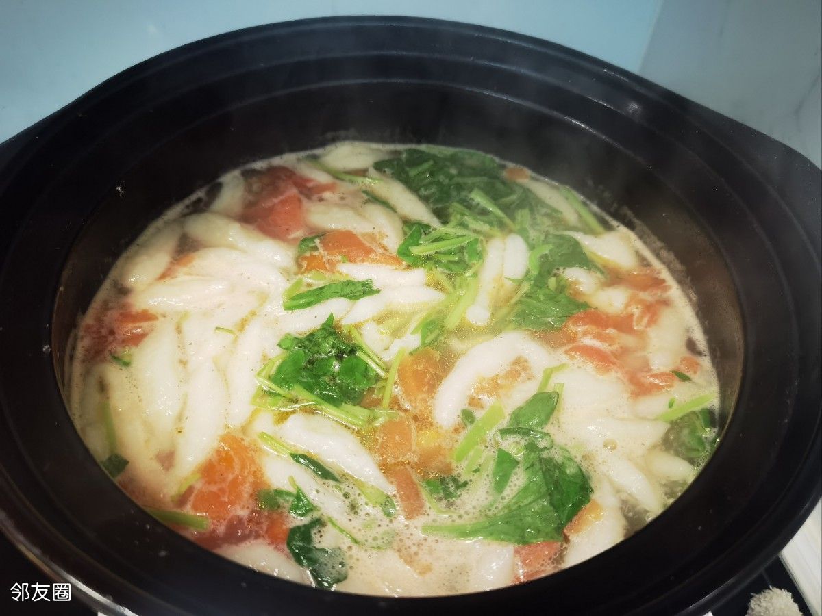 山药切片蒸熟碾成泥,加面粉和成面团,起锅放点油将西红柿炒出汤汁后加水,用剪刀✂️剪成小鱼儿状态入锅,放入青菜,加点盐调味儿,开锅既熟!