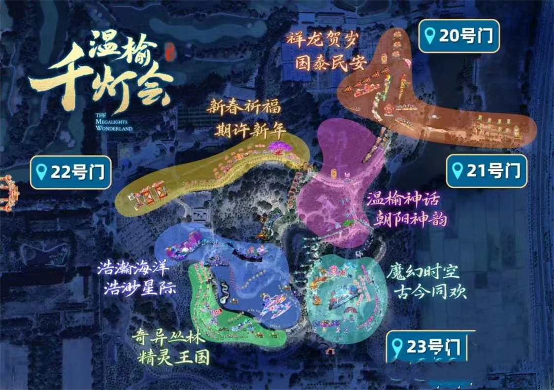 温榆河千灯会分为“祥龙贺岁”、“温榆神话”、“魔幻时空”、“浩渺星际”、“奇艺丛林”、“新春祈福”等六大主题区域,