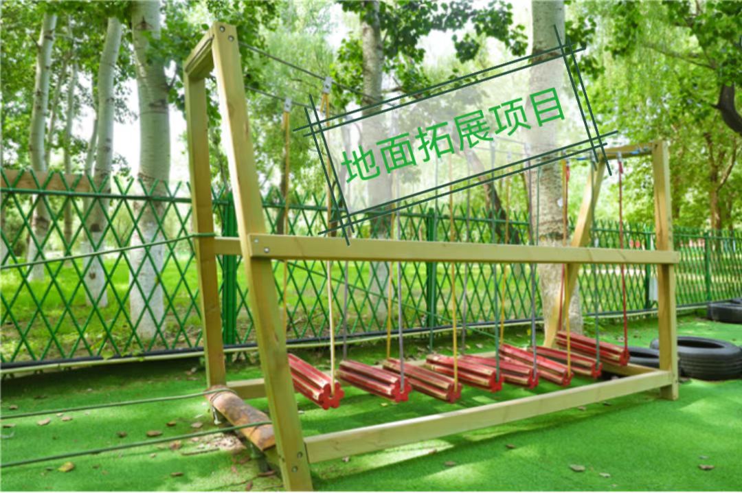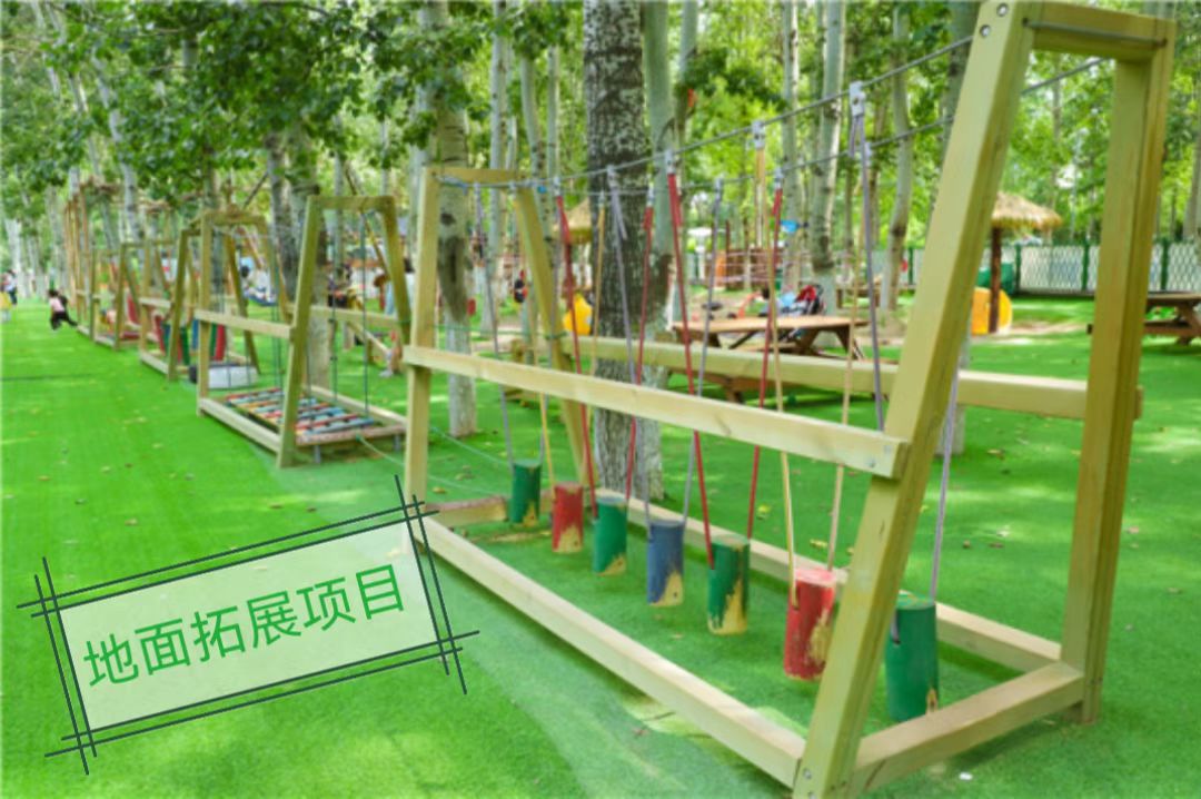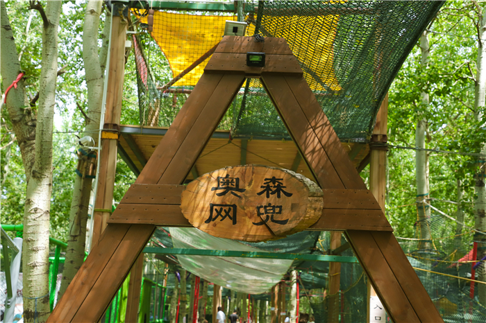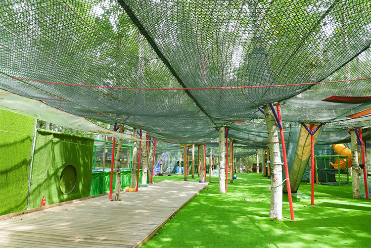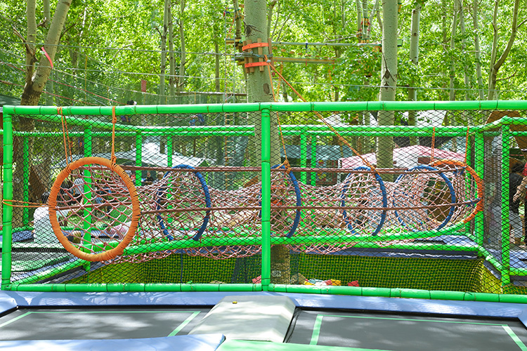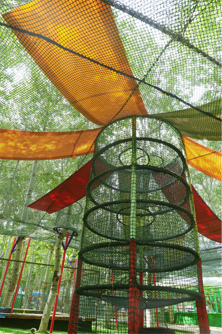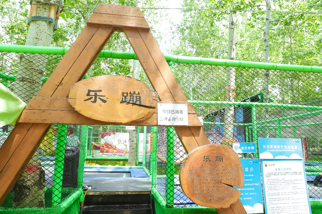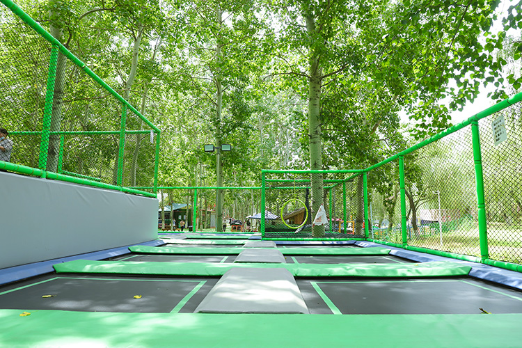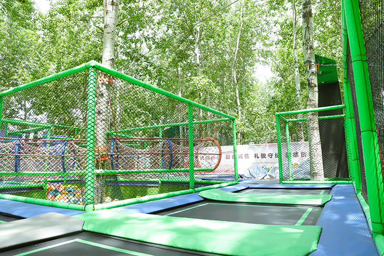 若干个独立小蹦床(2米*2米)和两个大蹦床(3米*5米)组成,总2000平方米,蹦床在树林中,即使热天气也不会很热。