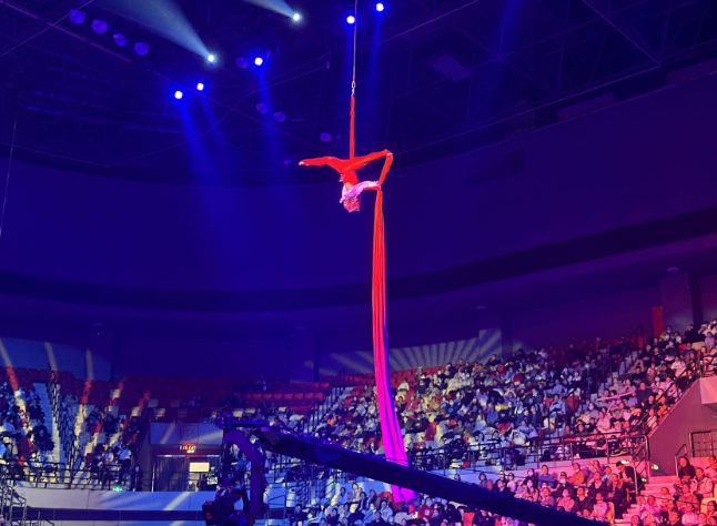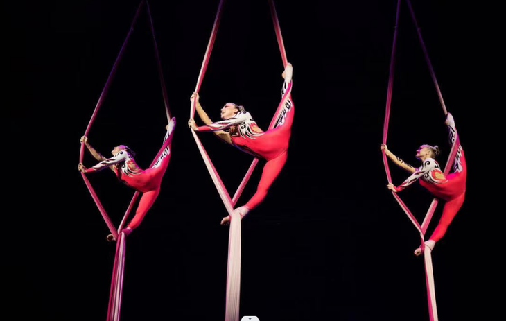 在高空绸吊表演中,演员身着华丽的服装,借助绸吊在高空中展示出优美的动作和柔韧的身姿。她们可能会进行空中舞蹈、空中芭蕾、绸吊旋转等各种惊险又优美的动作,将观众们带入一个充满梦幻和神秘的世界。
