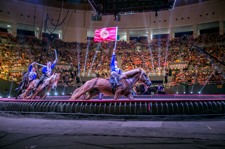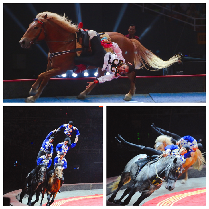 在吉尔吉斯斯坦和哈萨克斯坦,骑马是人人皆会的技能。在这里,你能看到优秀的马术表演团队奉上最精彩的马术绝活。6-8匹骏马将在舞台上奔跑,时而奔驰时而雀跃,驯马师将在奔驰的骏马身上展现各种骑行姿势和飞马过肚、双人倒立等高难度的动作表演。更惊艳的是两位驯马师将骑着两匹骏马,还有两层演员站在驯马师的身上叠罗汉。小朋友们一定会惊叹人马合一的配合而为之鼓掌!