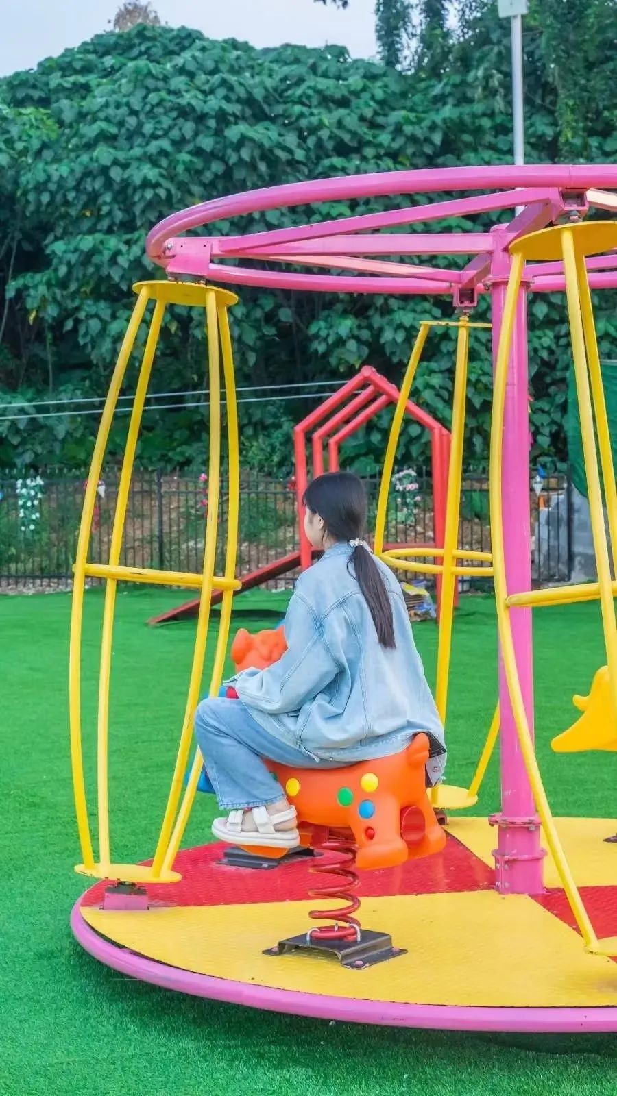 旋马是乐园的标配项目坐上它就仿佛进入了浪漫的童话世界随着好友的协作转动它开始缓慢地旋转起来,梦幻又惬意