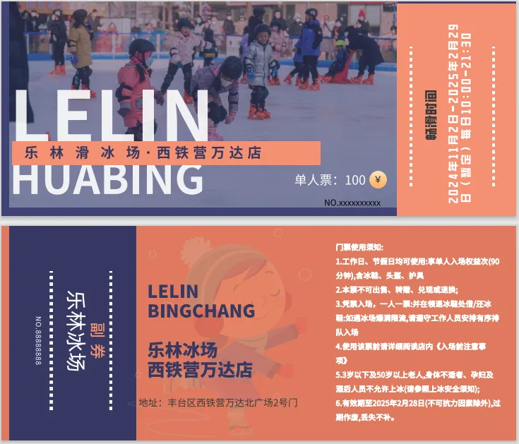 3.凭票入场,一人一票:并在领退冰鞋处借/还冰鞋:如遇冰场爆满限流,请遵守工作人员安排有序排队入场
