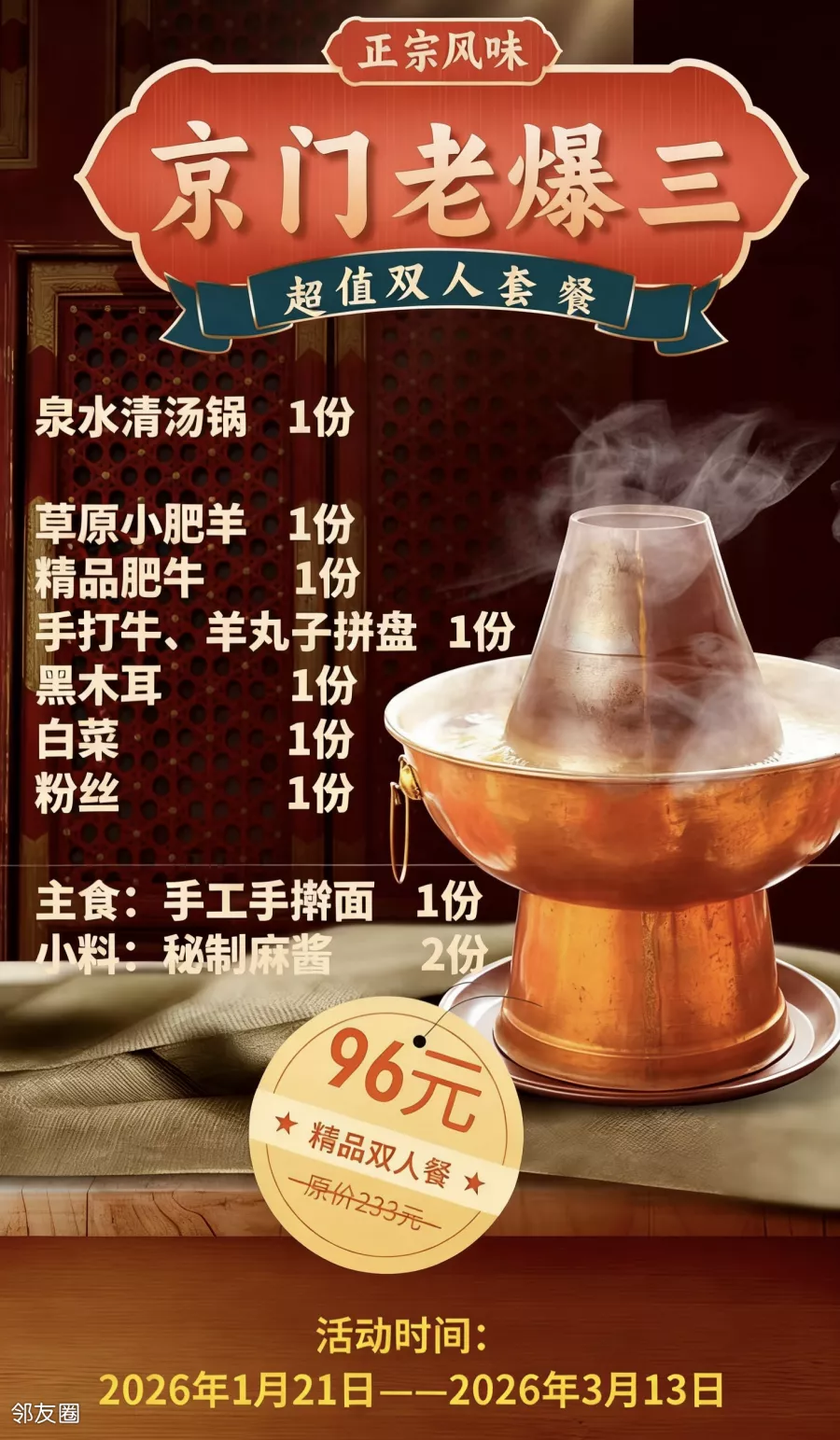 邻友们,重点来了!京门老爆三为望京网粉丝推出超值福利!这可是独一份的宠爱,店里是没有的,只有在咱们平台才能解锁这份福利。那可是诚意满满,福利爆棚~