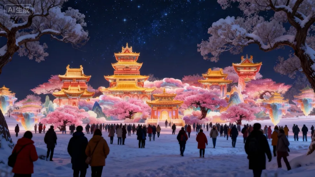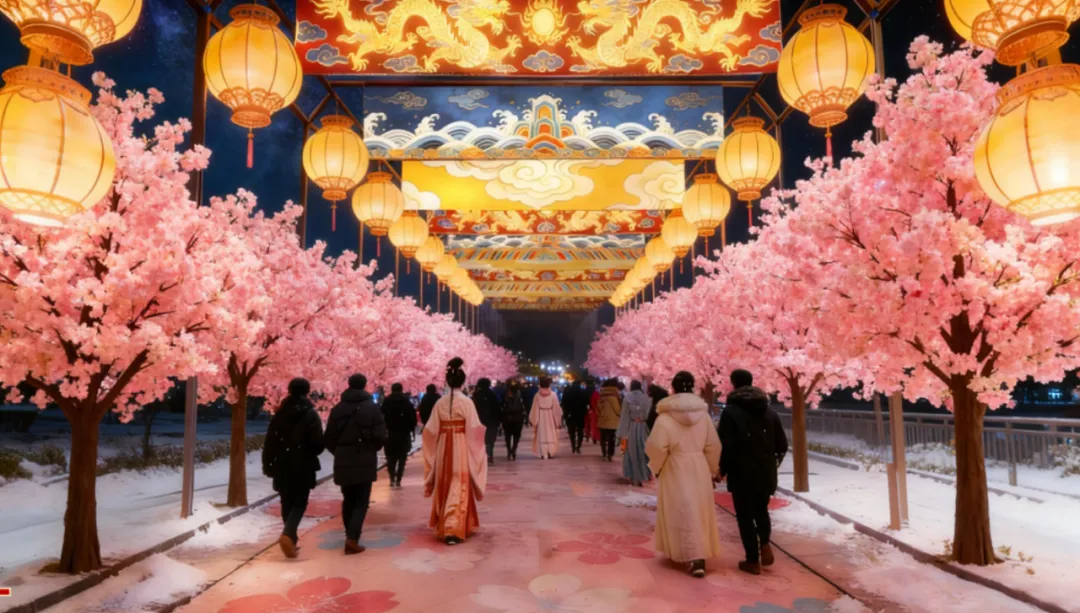 沿途“华灯初上”树挂宫灯、“天章赐福”御笔吉语灯等串联成新春通道,传递美好寓意。