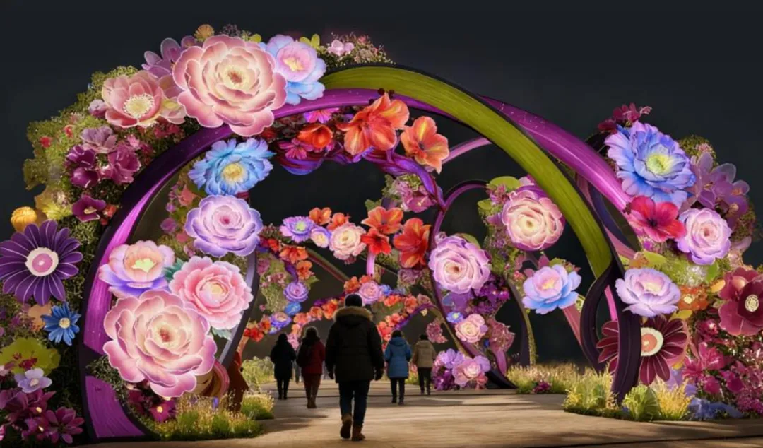 “霓裳琼影”灯组演绎“人映花、花照夜”幻境,演绎一幕幕流动的光影浪漫。
