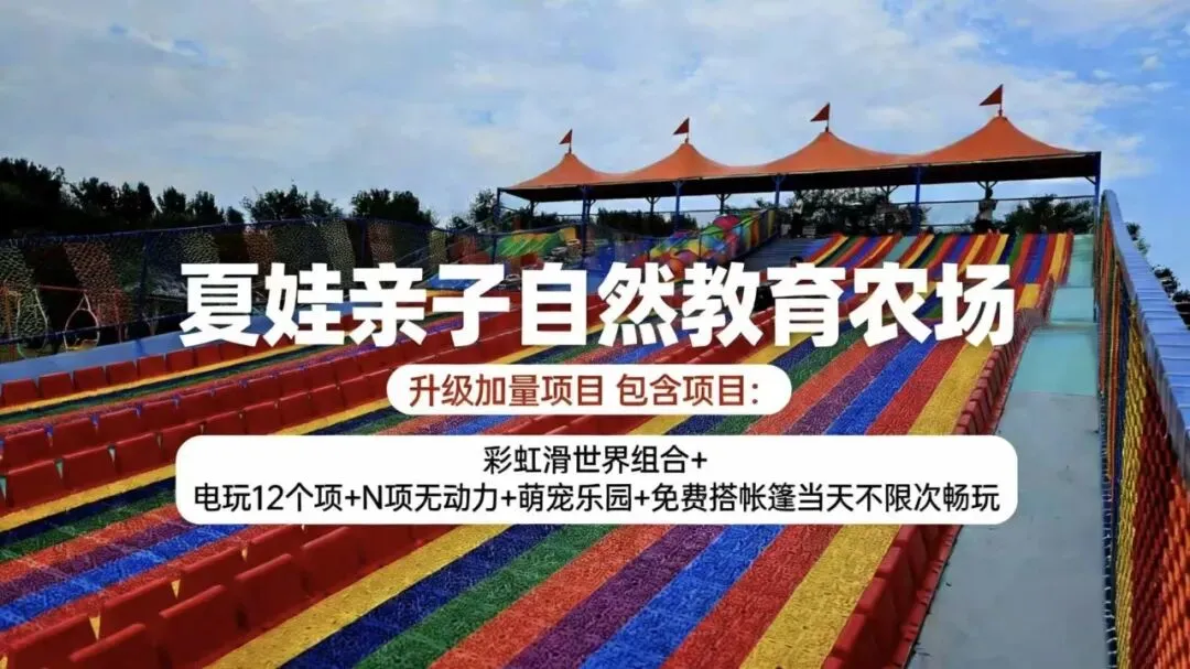 大型彩虹滑道、多种滑梯、趣味爬坡、滚塑滑梯、轮胎坡一站式解锁!色彩斑斓的滑道像一道彩虹铺在田园间,坐上滑板飞速下滑,风里都是童年的笑声,大人小孩都能玩,当天不限次畅玩,想玩多少次就玩多少次~