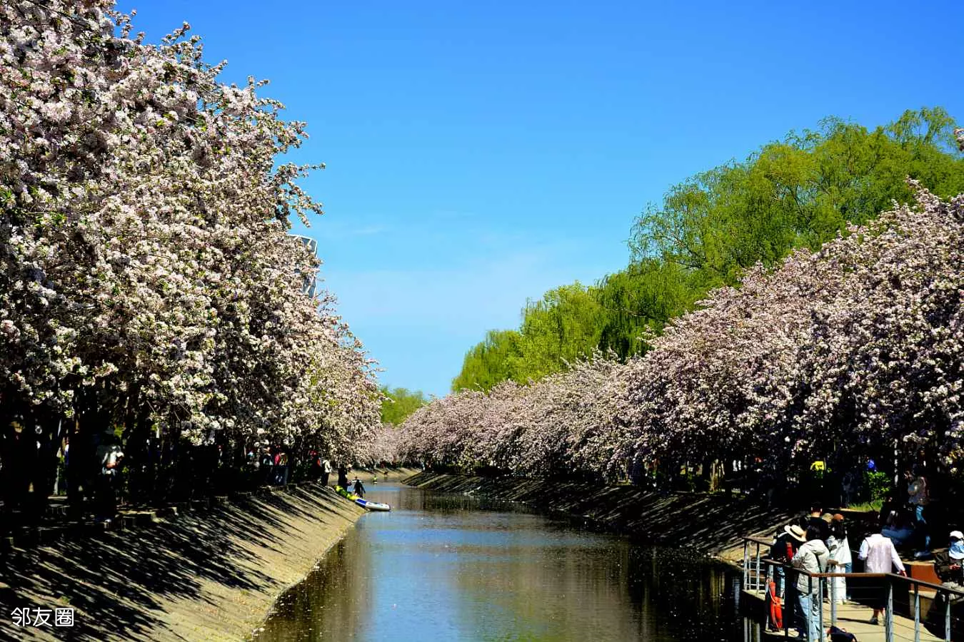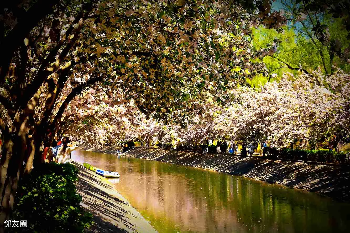 #第三届望京海棠花溪摄影大赛珍爱河道,美好家园!2026年4月8日,望京海棠花溪,工人在清理河道水面上的海棠花瓣及杂物,让花溪更清洁美好。刘宪国摄!(13120