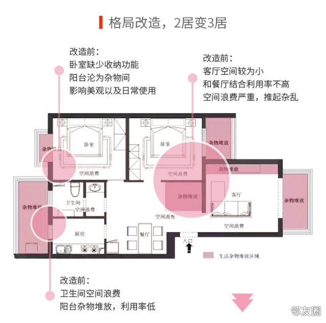 在不影响房屋承重的前提下可以拆改墙壁形成开放式空间,这样也可以使空间变得更大。