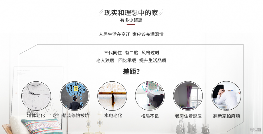 首当其冲的就是要对房屋整体做一个全方位的了解。其次再根据家庭成员需求进行设计改造,老房一般问题主要是: