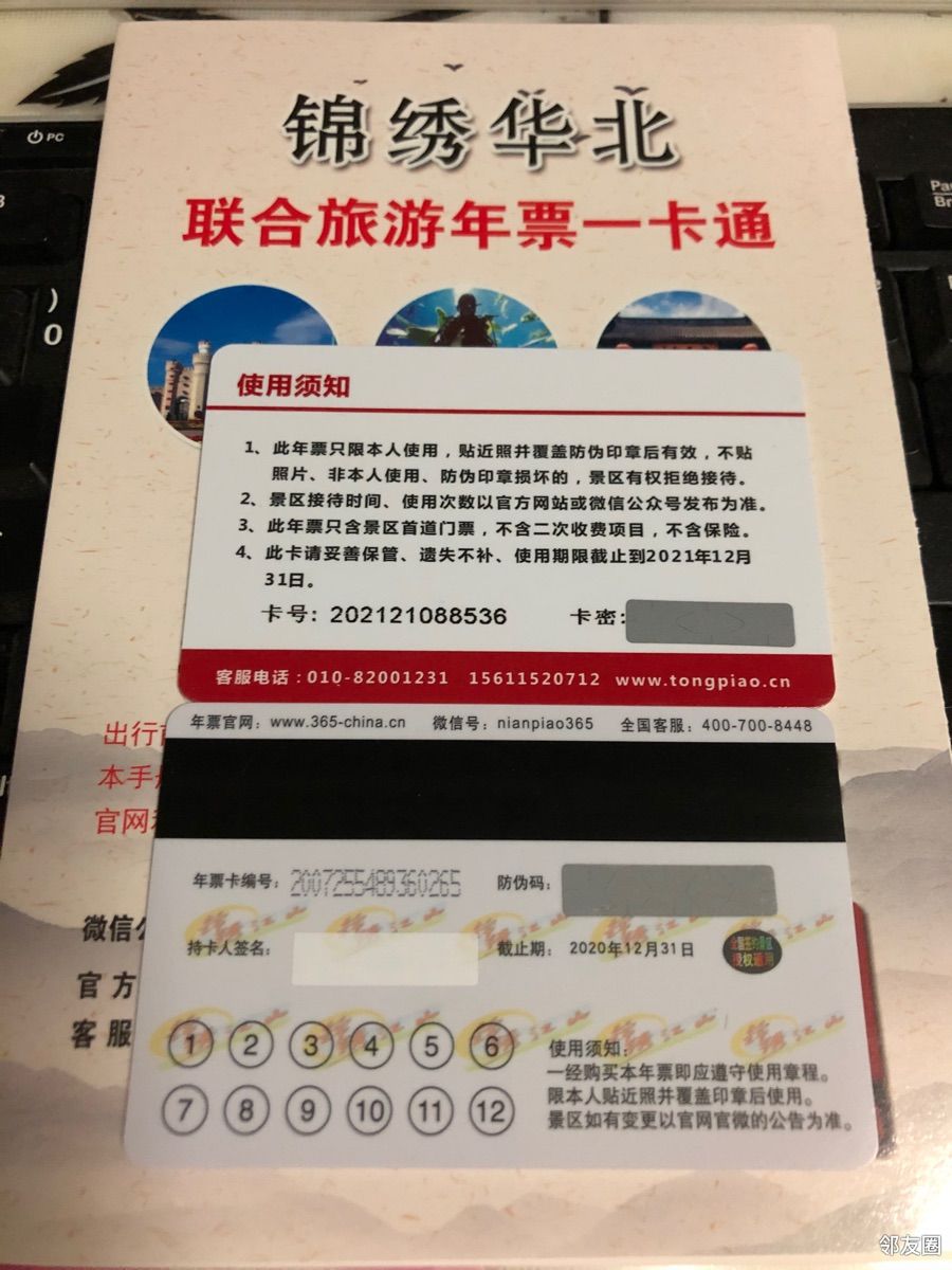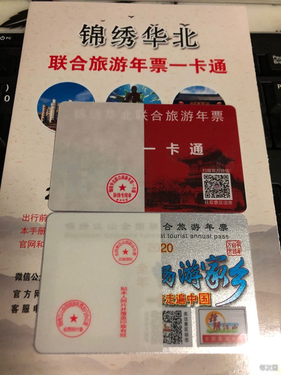 包装完好,打开后有两张卡,放在一个塑料膜里。红色为2021年华北联合旅游年票,银色为赠送的2020锦绣江山全国旅游年票。