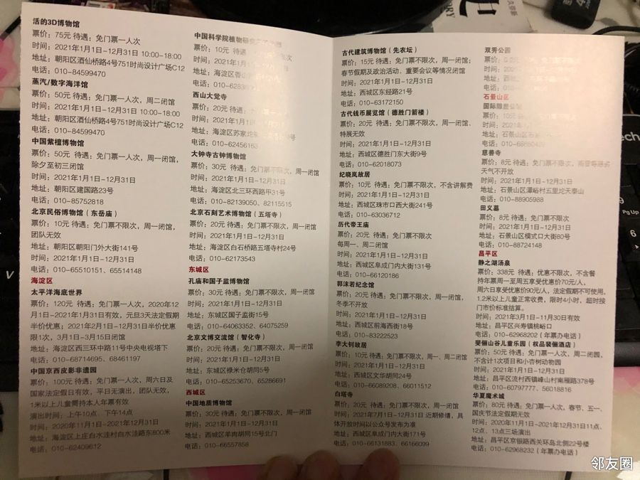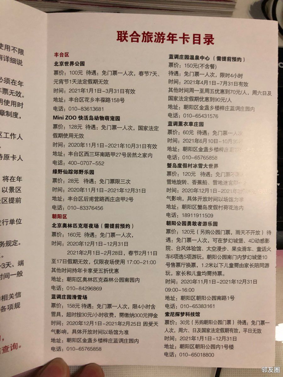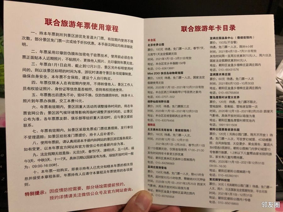 还有一张2021年北京版使用手册,内页为景区具体使用说明,包括景区地址,免票规则,使用时间,联系电话。特别是使用时间,提醒大家注意!每个景区的使用时间不一,只有在规定时间内使用方可享受免票政策!