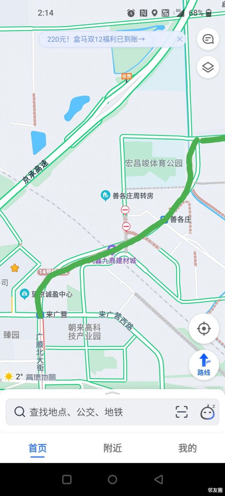 车行至来广营路口,按照之前的习惯,站在直行车道,发现不能左转了,只能直行,于是就沿路直行了,今天是广顺北大街北延第一天开通,正好驾车尝新,其实这条路没开的时候,一直是锻炼身体的备选,不是第一天次见,但是开车上这条路,感觉还是不太一样,感觉就是路真宽,车真少,连快递车,自行车都上主路了。