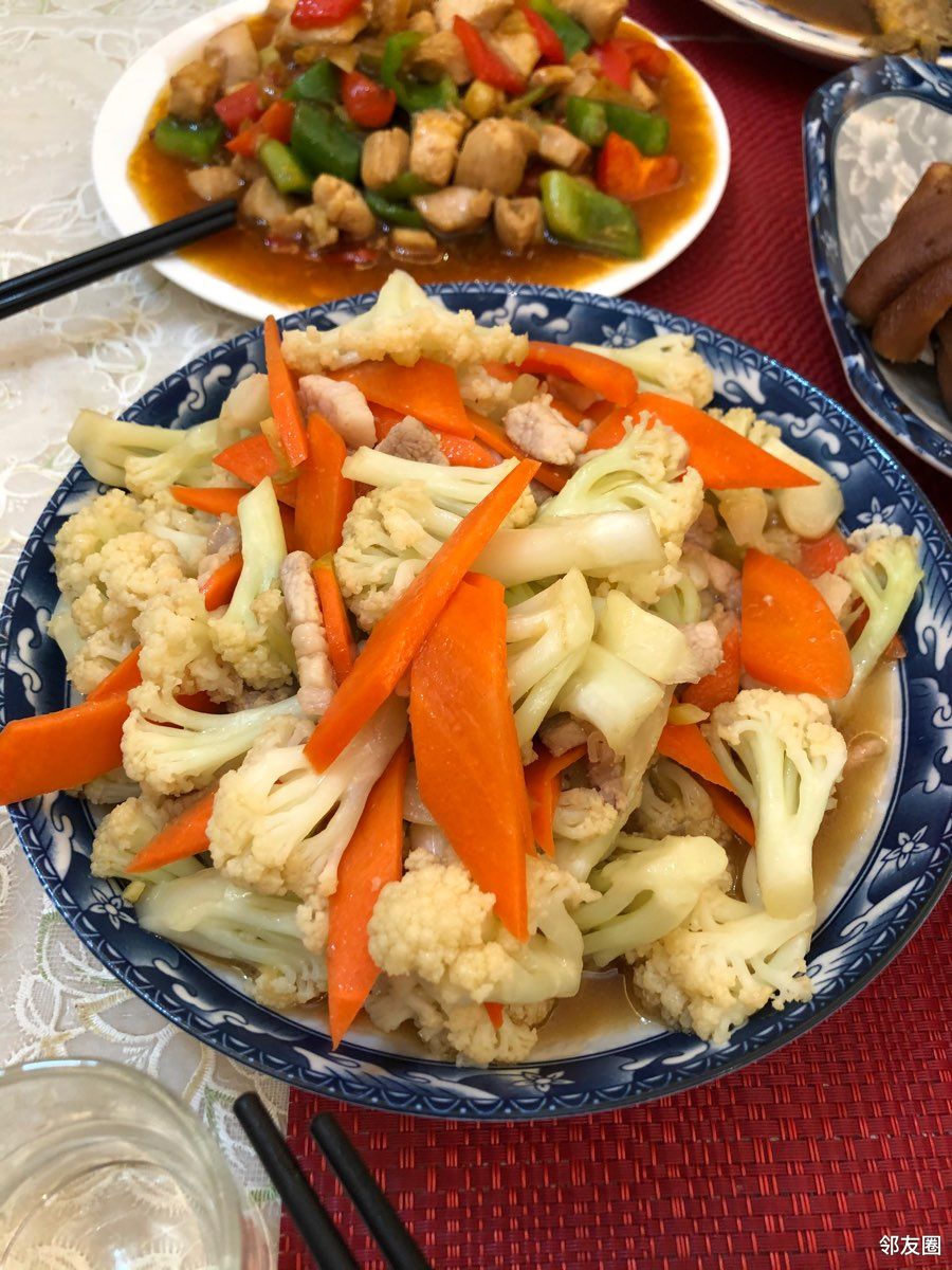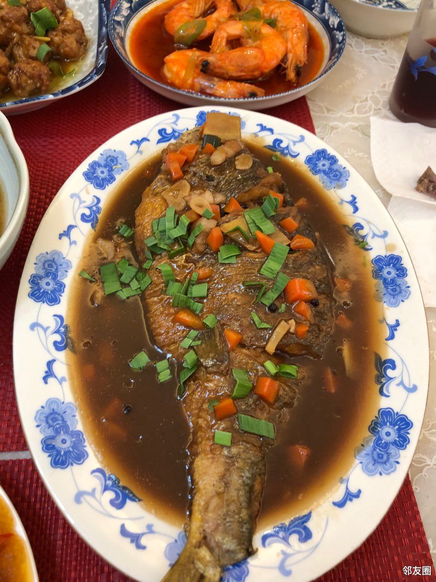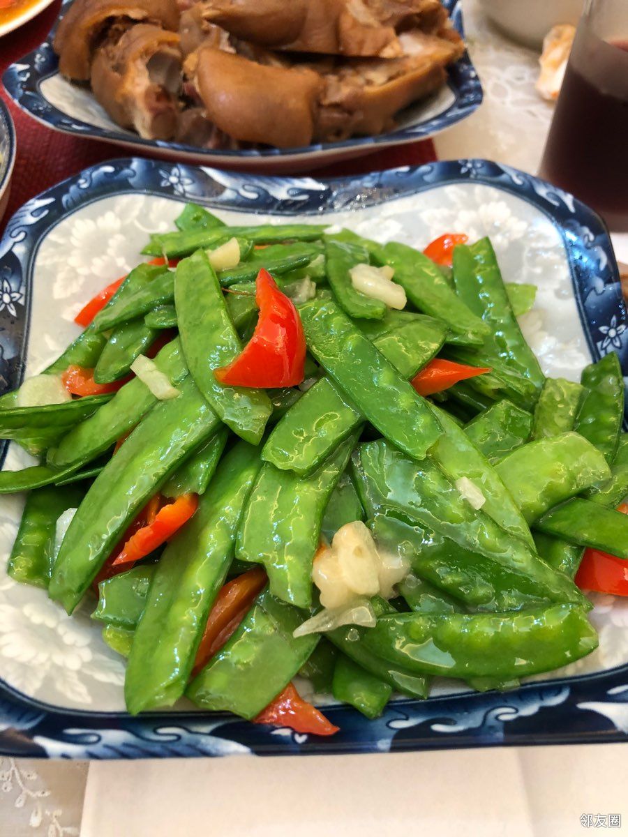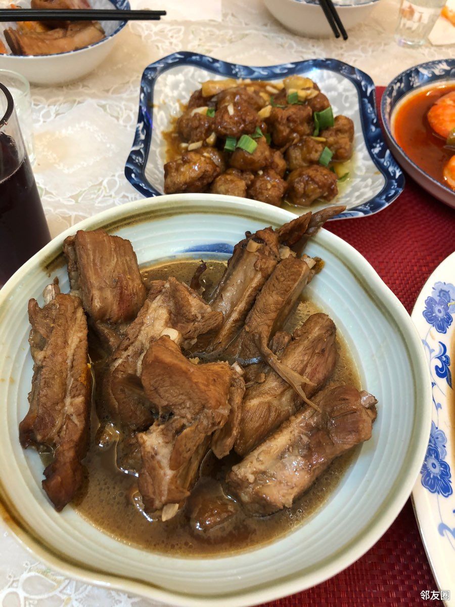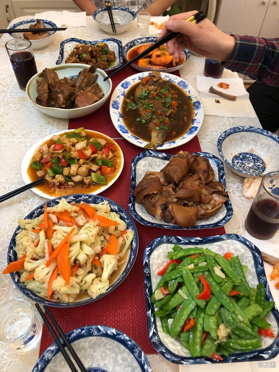 大年初四比年三十和正月初一吃得好,因为家里来客人,6人餐,8菜。炖黄鱼,酱猪蹄,红烧排骨,油焖大虾,焦溜丸子,宫保鸡丁,清炒荷兰豆,清炒菜花胡萝卜,陪二舅喝二两,很高兴的一天