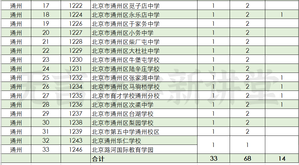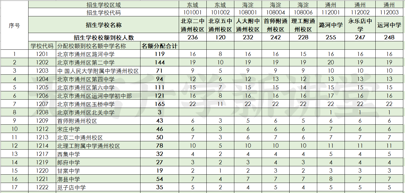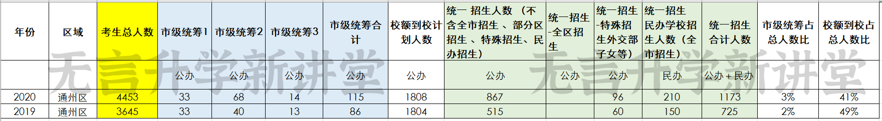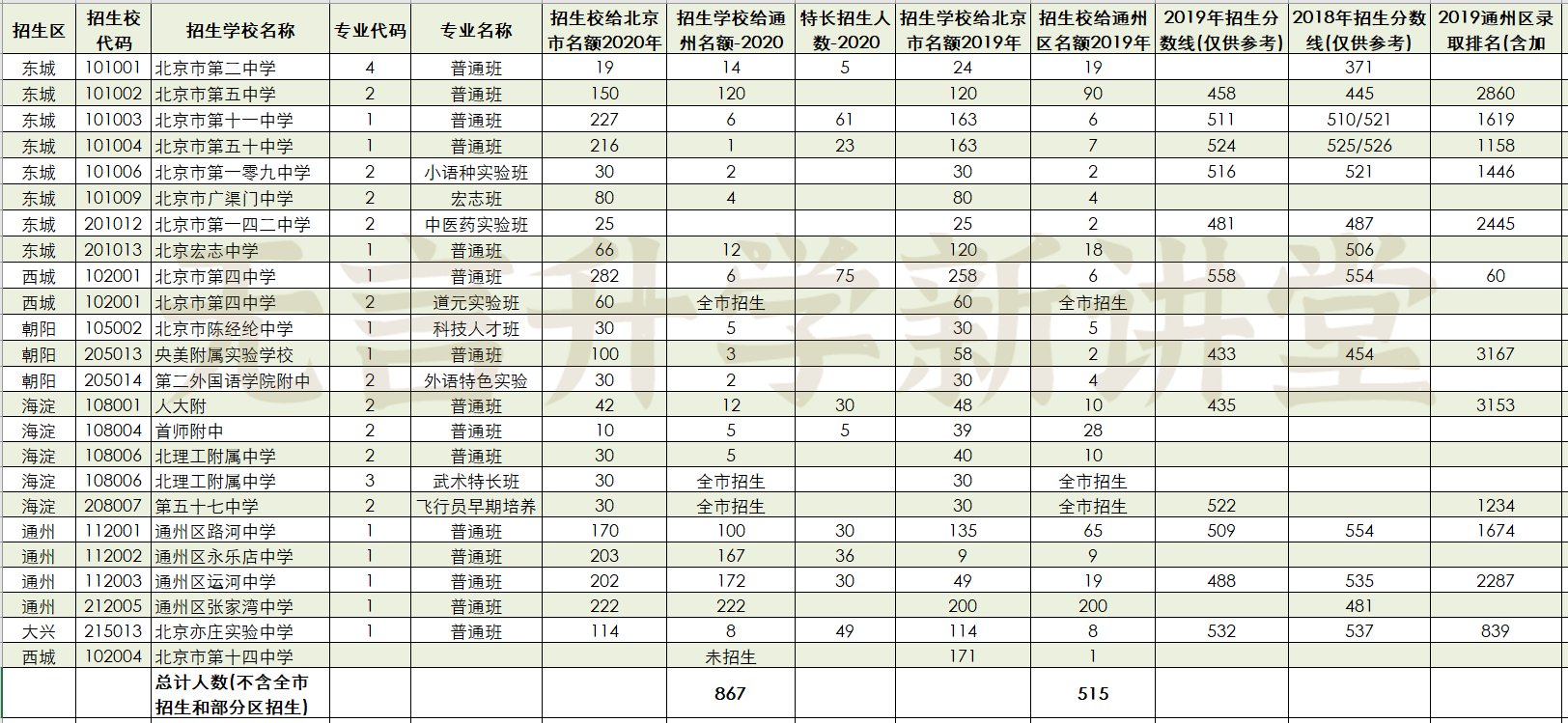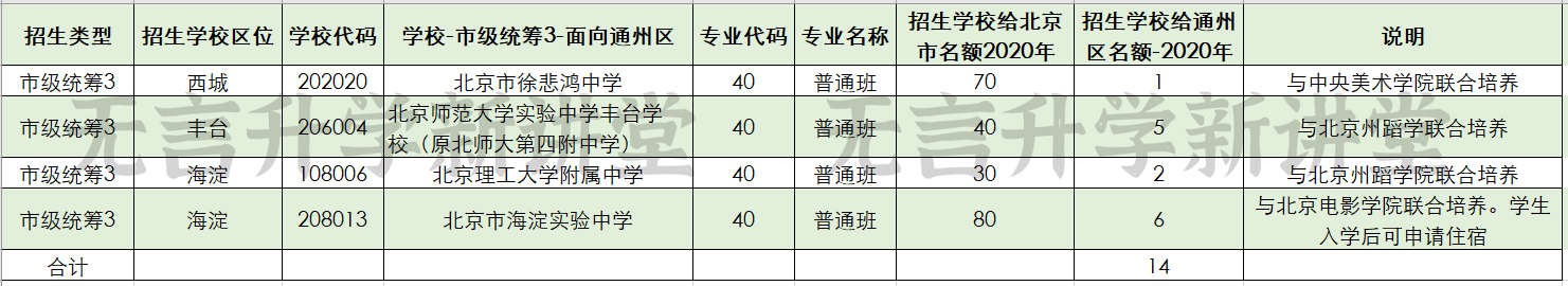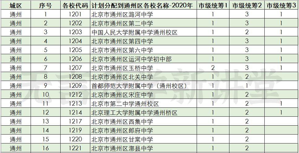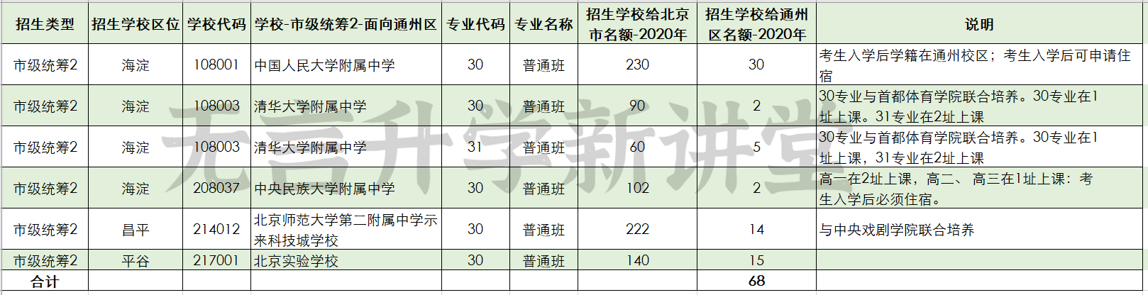 我们重点看2020年市级统筹的招生计划,这是通州考生通过中考出区最重要、名额最多的路径: