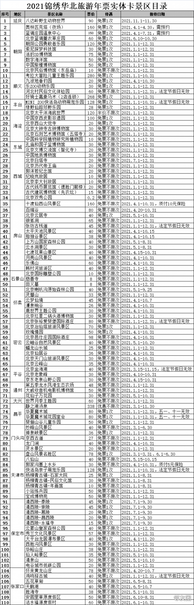 锦绣华北联合旅游年票一卡通,共包含京津冀地区100多家著名风景区、森林公园、大型游乐场、温泉水世界、滑雪场、海洋馆、野生动物园、文化遗址、博物馆、文化演出、儿童体验馆、亲子乐园、快乐农场等,其中70多家免票不限次,30家免费1次,部分折扣优惠,可畅游八达岭野生动物园、太平洋海底世界、奥林匹克塔夜场、勇敢者游乐园、蓝调温泉、考拉大冒险儿童成长主题乐园、快活岛动物萌宠园、绿野仙踪郊野乐园、斐俪山谷儿童乐园、乐ZOO动物乐园、蓝调滑雪场、蓝调薰衣草庄园、十渡仙西山、太平天池风景区、猕猴谷景区、神泉峡、百瑞谷、喇叭沟原始森林公园、灵慧山、蟠龙山长城、妙峰山、华夏魔术城、上方山、银狐洞、云居寺、世界月季主题园、龙门涧、金海湖、大觉寺、大钟寺、中国地质博物馆、中科院植物园、活的3D博物馆、紫檀博物馆、冶仙塔、张裕爱斐堡酒庄、玫瑰情园、第五季生态农场、天津盘山、八仙山、宝成博物苑、小站练兵园、河北清西陵、野三坡清泉山、黄龙山庄、五花草甸等。适合户外游、文化游、亲子游、体验游、自驾游等。老少皆宜,四季适用,用1张门票的价格,实现了京津冀百家景区联网通用。