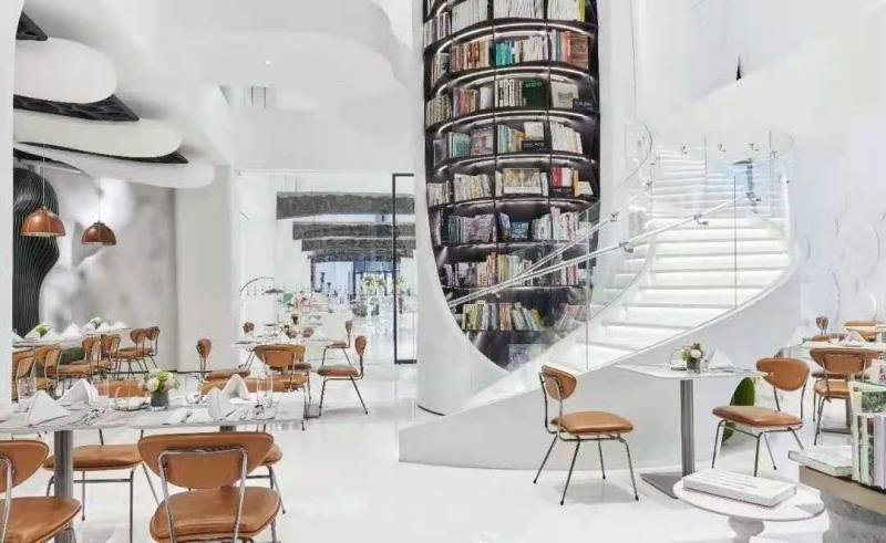 在鳞次栉比的高楼大厦之间,这座白色建筑显得有些“遗世独立”。这里是商业零售空间,也是一座艺术馆,全馆体量约3.5万平方米,其中艺术共享区就高达1.5万平方米。随处可见的洞岩装饰、龟兹洞天壁画、机械臂装置艺术……馆内“一步一景”的设计,带来跨越千年的文化交汇。在充满文化气息的氛围里,人们可以体验家居用品、参观样板间,或是在餐厅里品下午茶、在书吧里阅读,充分感受居室文化。