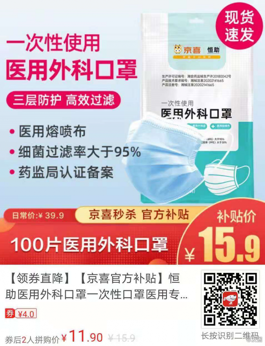 京喜官方补贴 恒助医用外科口罩 100片 只要11.9 最近北京风沙特别大 到公司口罩都一层土 一天一片口罩都不够用了 赶紧买一包囤起来呀