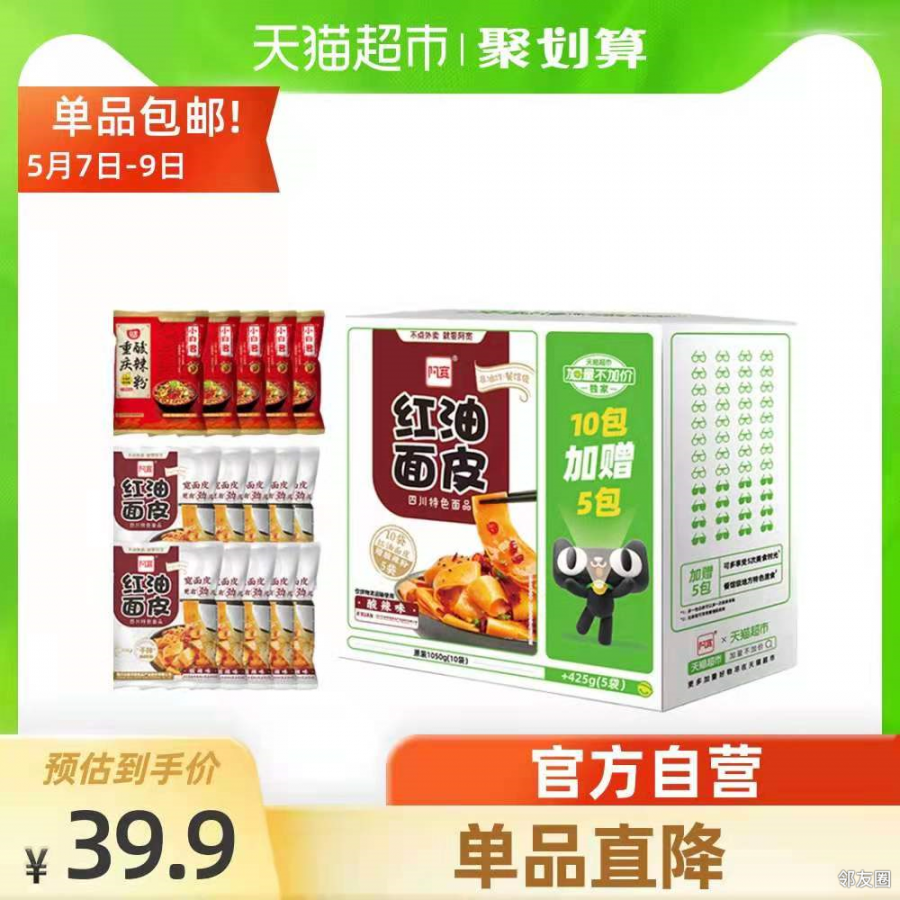 天猫超市商品!平时10袋阿宽的就要29.9了 相当于5块钱就搞定了5袋酸辣粉 !非常超值!这款红油面皮非常好吃,平时懒得做饭吃一袋面皮真的很不错!