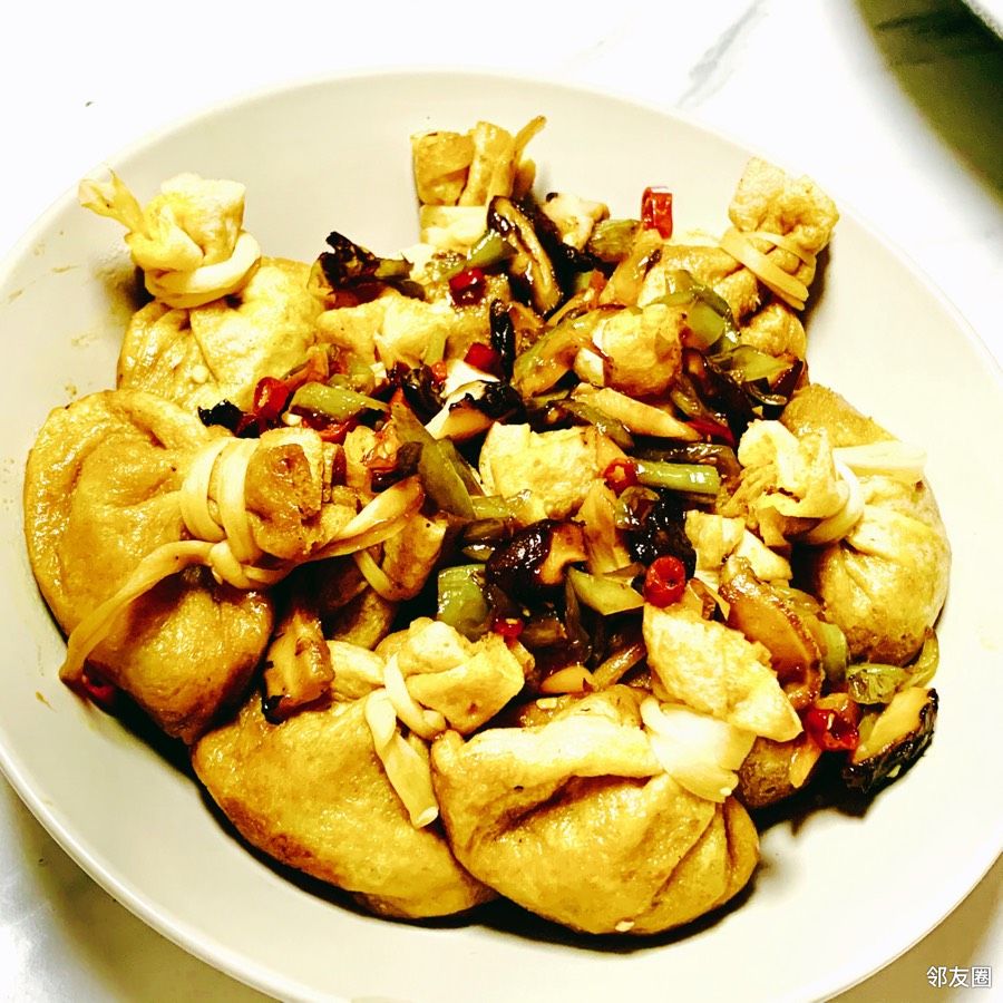 ❷“福袋豆腐”是用空心的油炸豆腐片、一边开口、填入肉馅、用干瓢绳扎口。