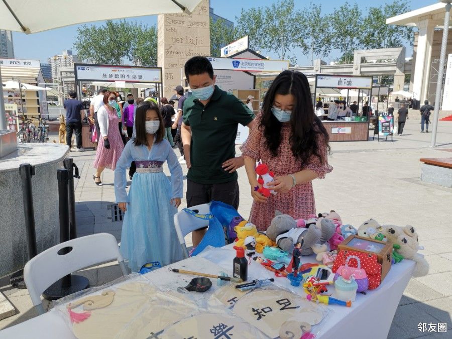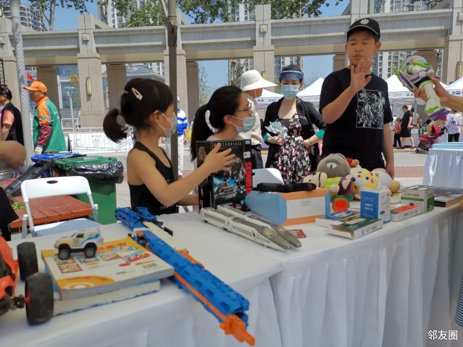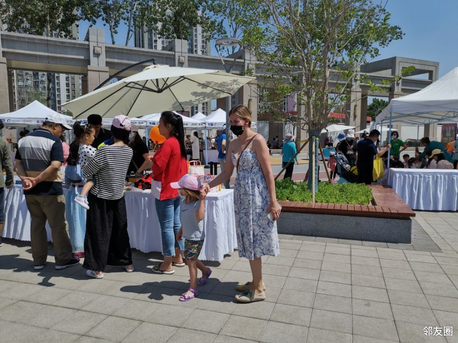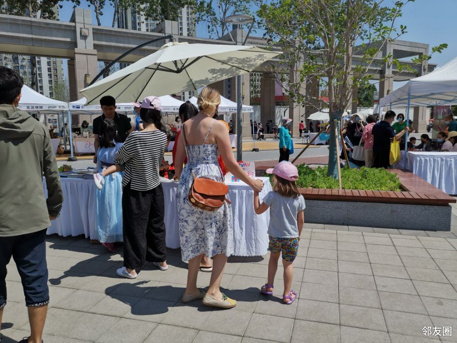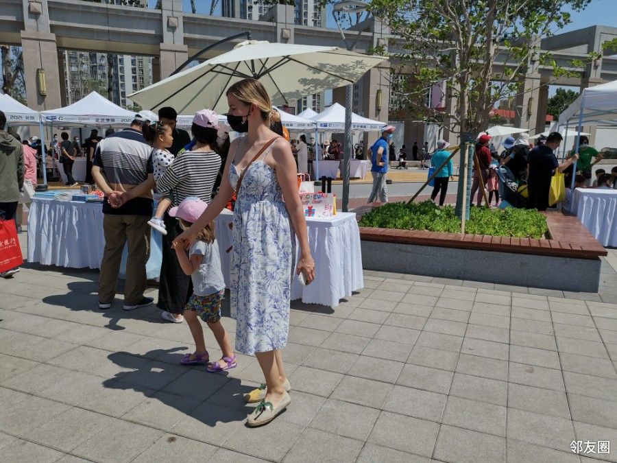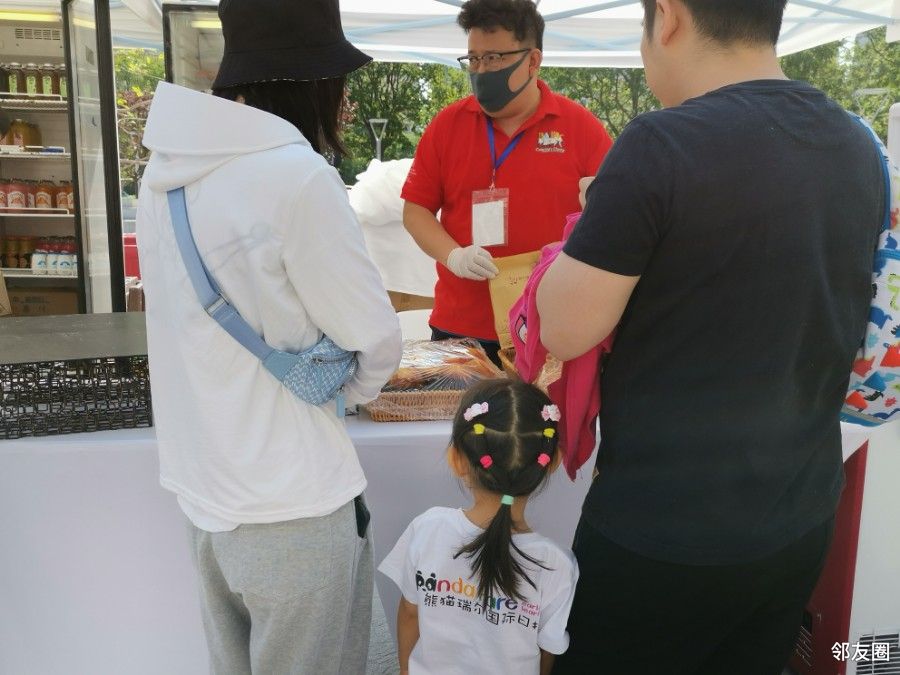这是一家三口的摊位,又一个一家的摊位,小朋友是主爵。只看到一个外国人,带小孩子。