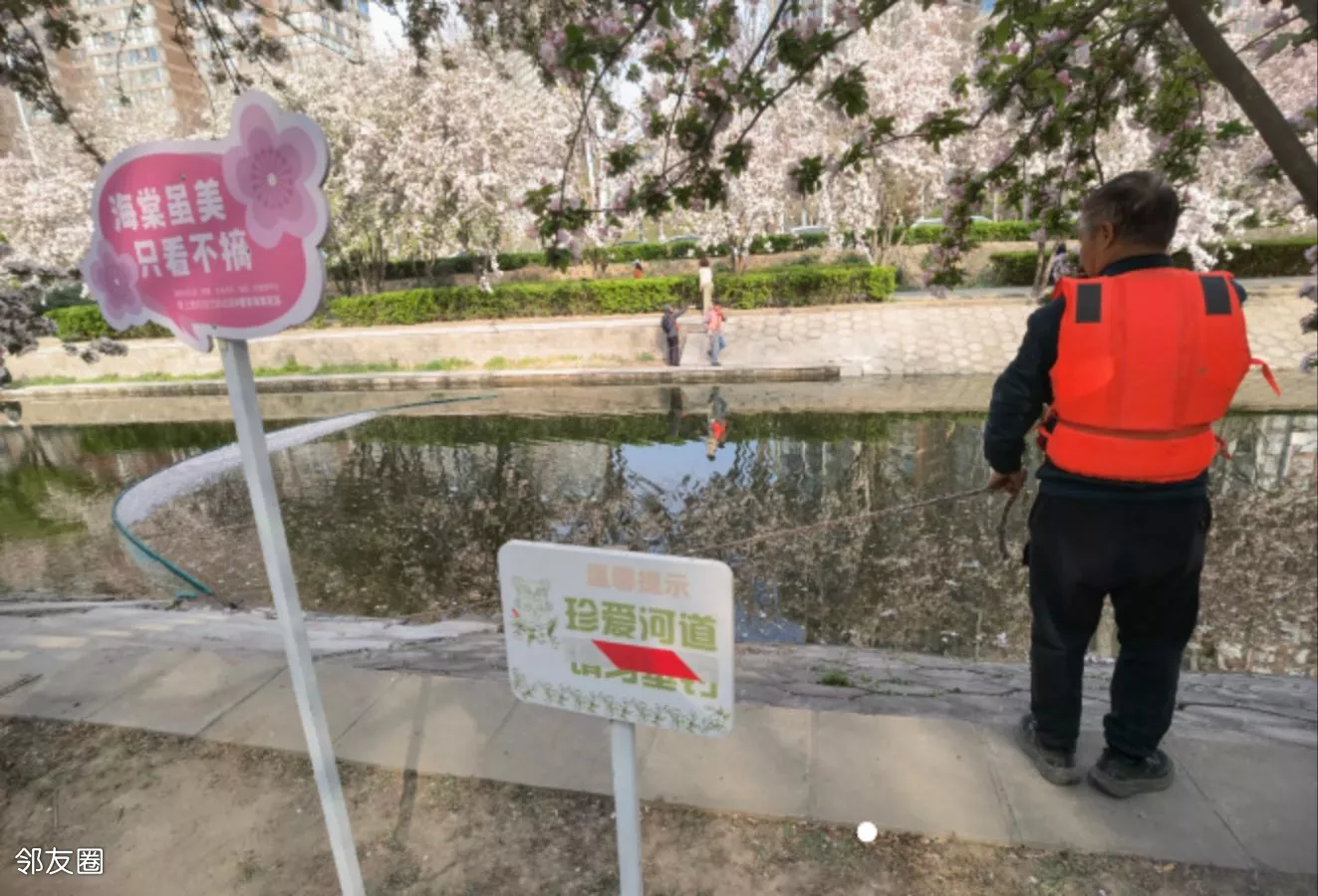 #第三届望京海棠花溪摄影大赛珍爱河道,美好家园!2026年4月8日,望京海棠花溪,工人在清理河道水面上的海棠花瓣及杂物,让花溪更清洁美好。刘宪国摄!(13120