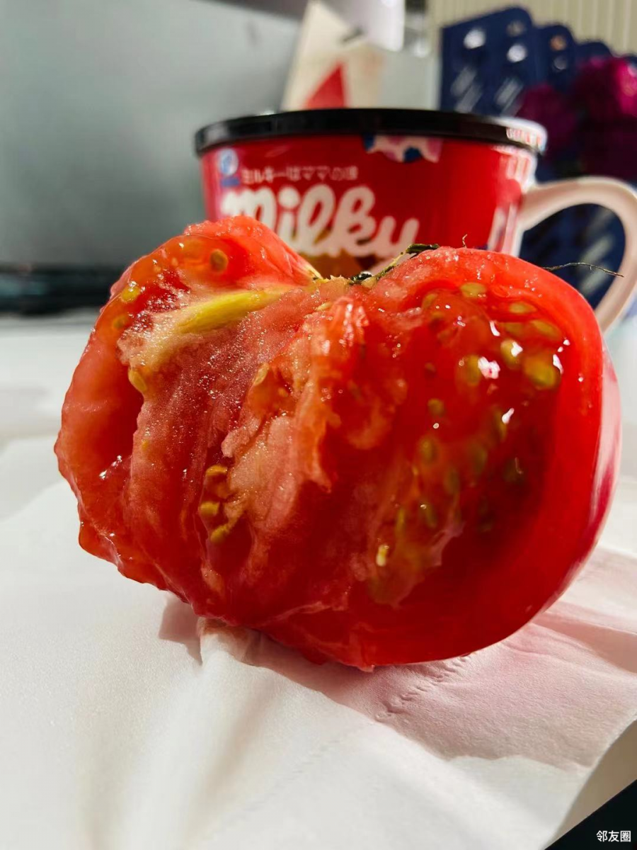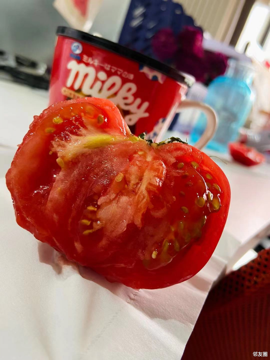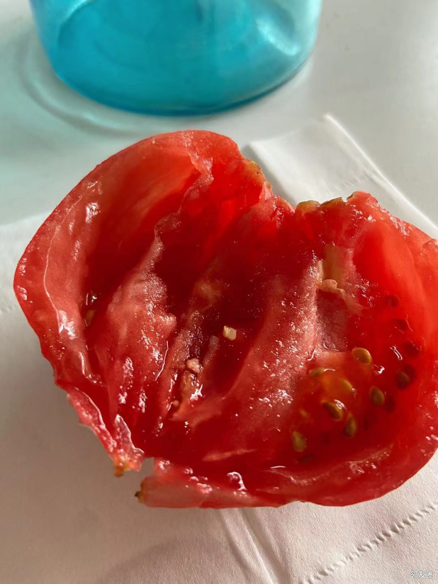 附上大券哥亲测视频 前几天买的桃太郎西红柿掰开一个给大家看看 掰开之后西红柿的清香扑鼻 可以清楚地看到里面的沙瓤 皮薄肉软 汁水丰富 不愧是上过国宴的西红柿!