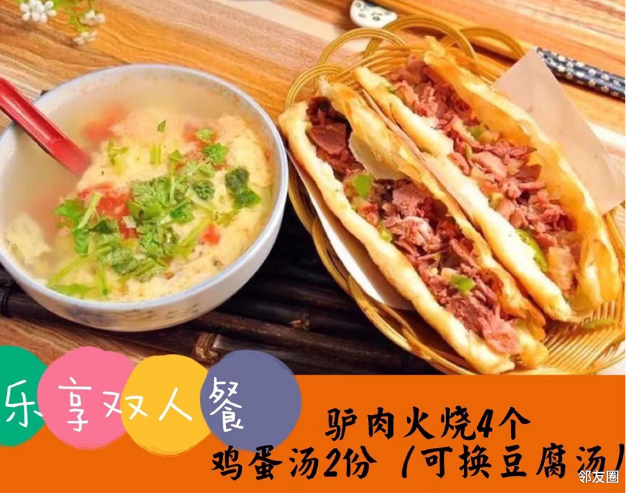 双人餐:普通驴火4个+鸡蛋2份(可以换成豆腐汤)原价48元,现价35.8元