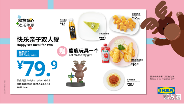 福利1:快乐亲子双人餐( 意大利面+儿童餐+抹茶芝士蛋糕+NFC 果汁+达拉马鸡块)赠送宜家限量版麋鹿玩具一个