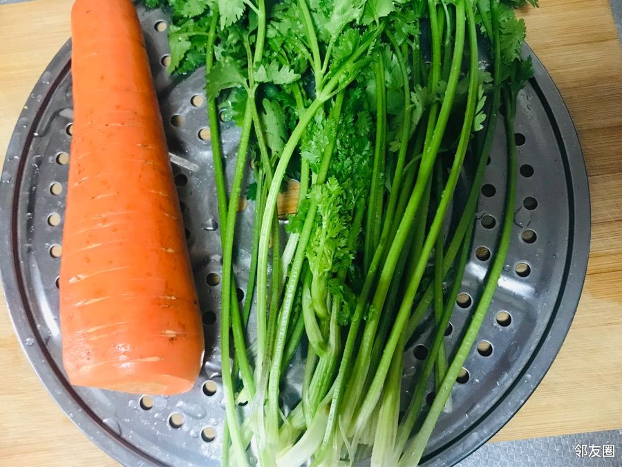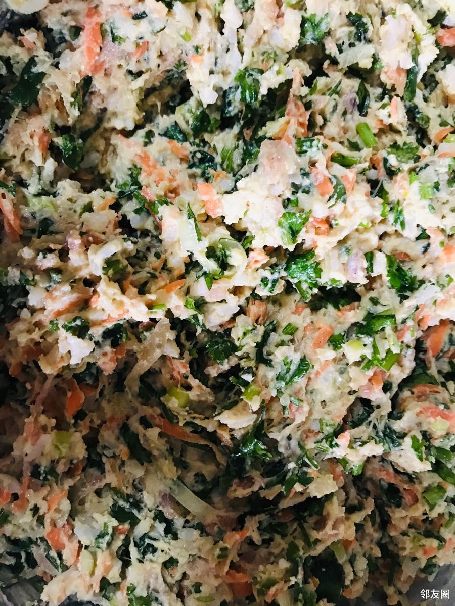 用料:胡萝卜,香菜,鸡蛋,葱姜,生抽,老咸菜,点点盐,十三香,豆腐,面粉,米饭少许,一起拌好!