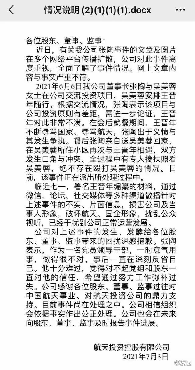 航天投资控股有限公司党委书记、董事长张陶同志酒后打人事件发生以来,中国航天科技集团有限公司党组高度重视,作出对张陶同志即日起暂停履职、配合调查的决定。