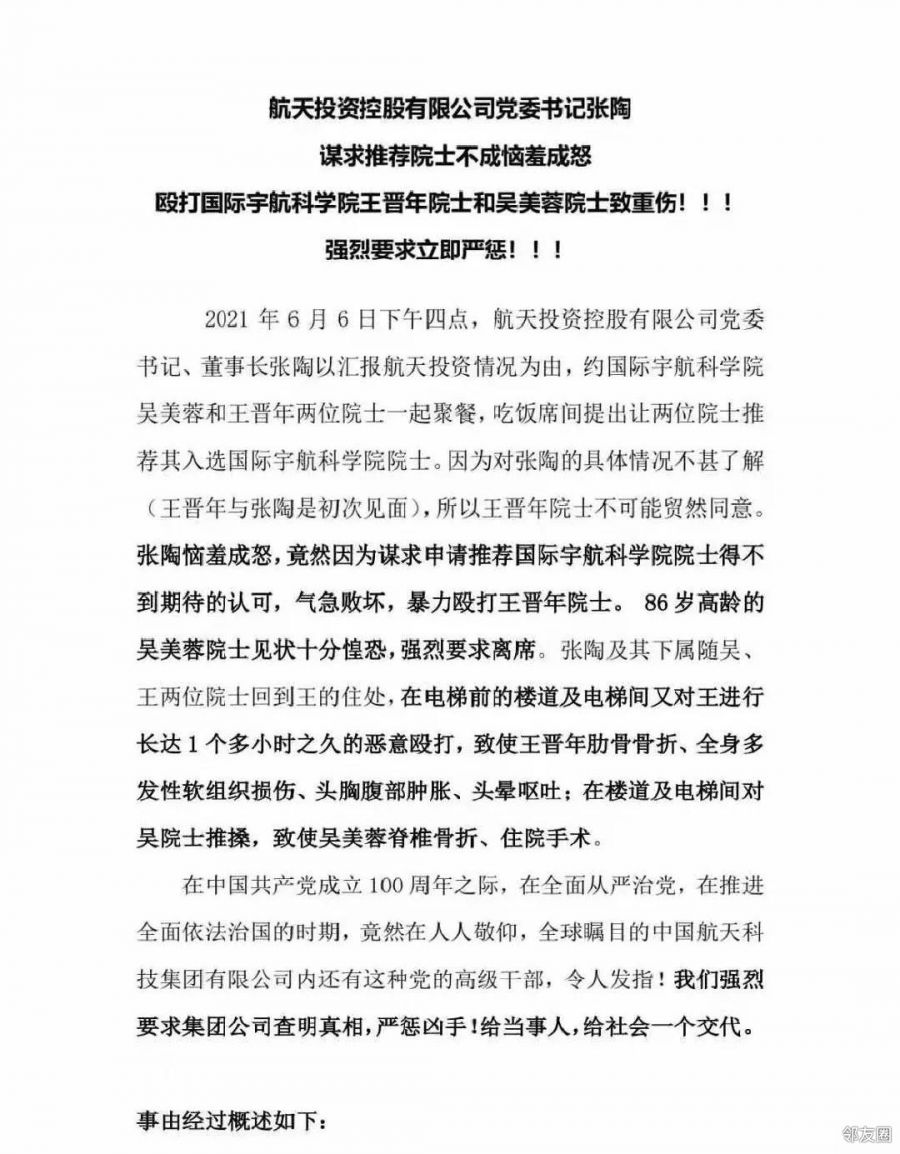 近日,一则“航天投资控股有限公司党委书记、董事长张陶酒后打伤两院士”的消息,在网上引发关注。7月4日,中国航天科技集团有限公司发布通报称,张陶即日起暂停履职、配合调查。