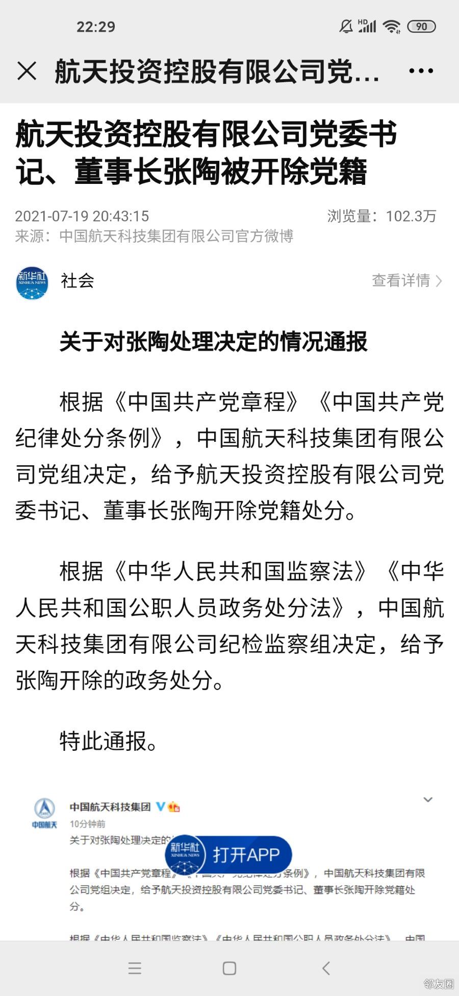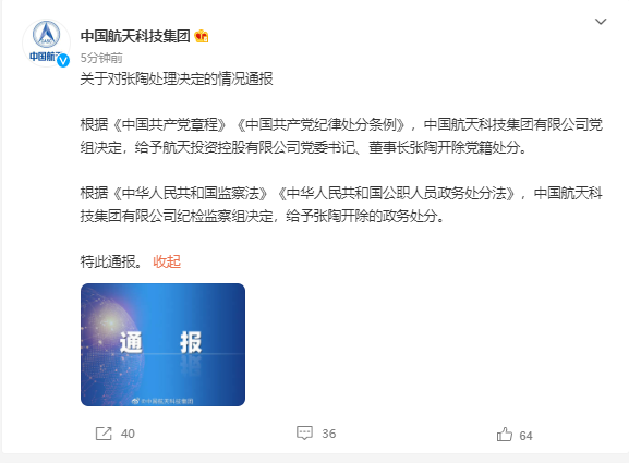 中国航天科技集团关于对张陶处理决定的情况通报: