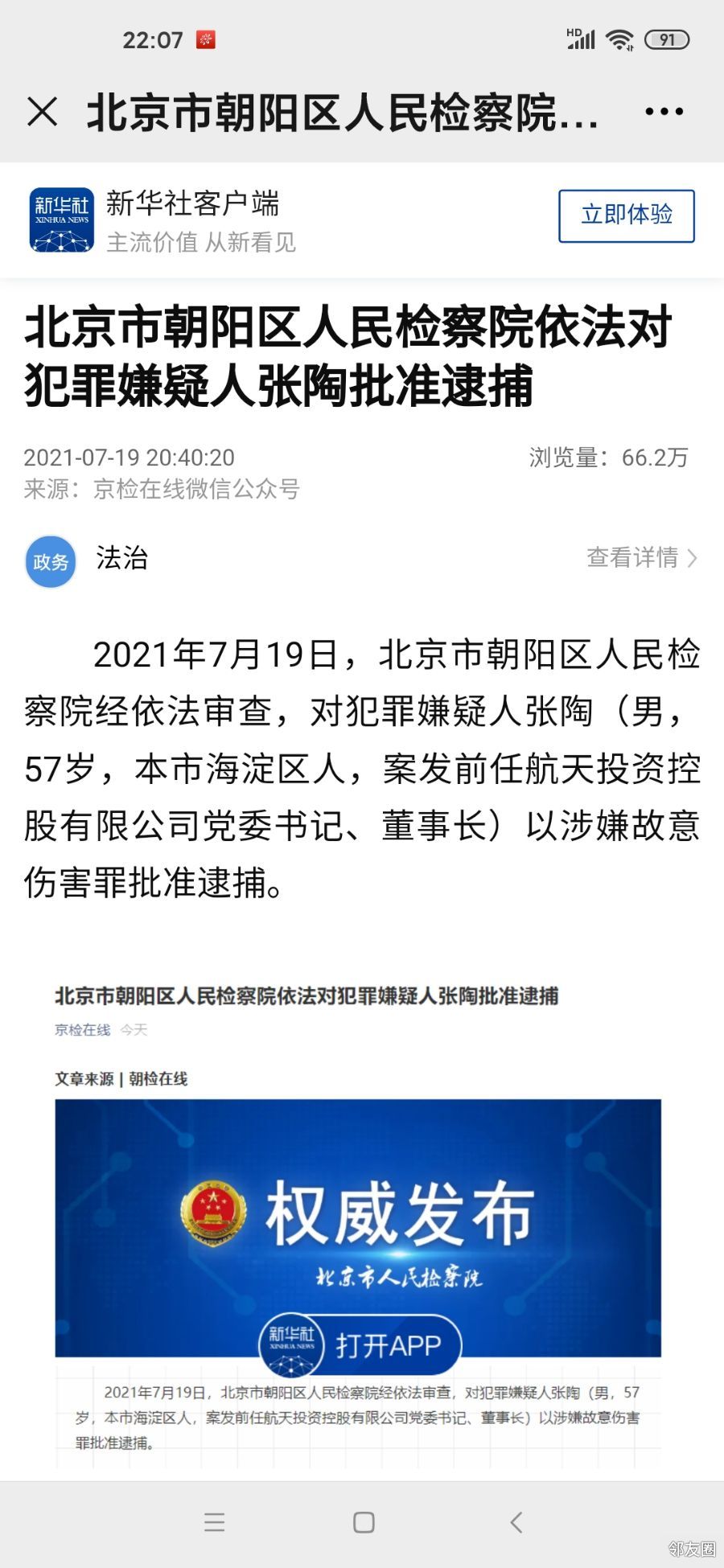 7月5日晚,有关航天投资控股有限公司党委书记、董事长张陶殴打国际宇航科学院两位院士王晋年、吴美蓉的事件有了进一步消息。根据 @平安北京朝阳,朝阳公安分局已依法对张陶刑事拘留。