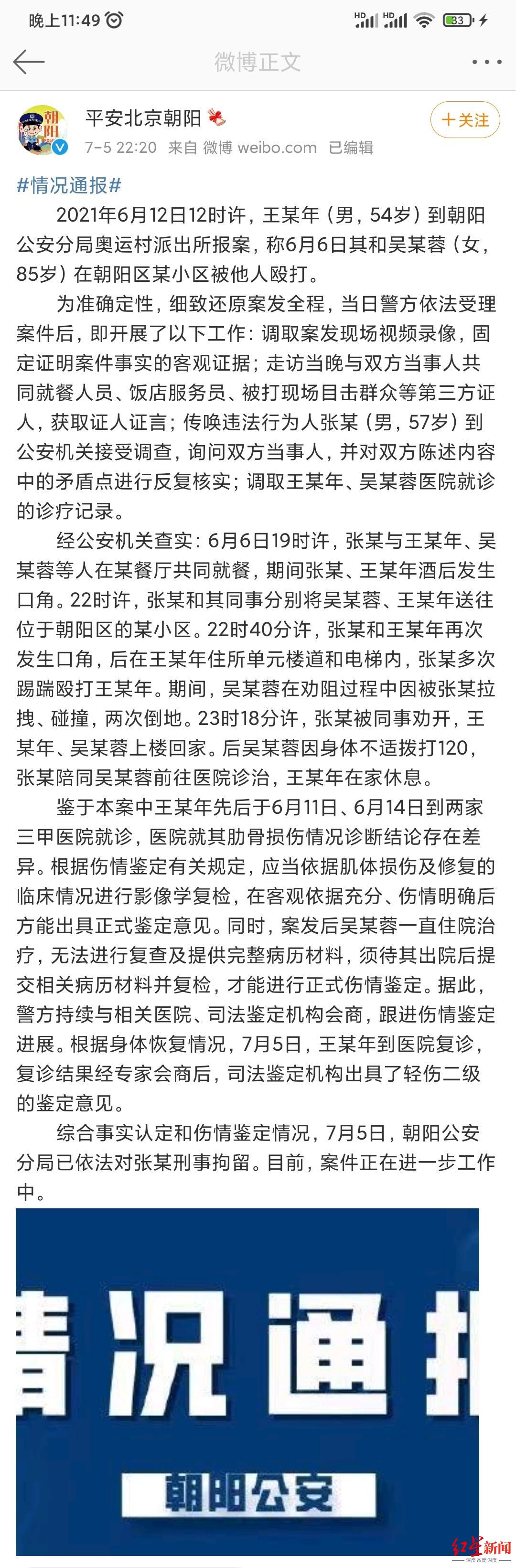 综合事实认定和伤情鉴定情况,7月5日,朝阳公安分局已依法对张某刑事拘留。目前,案件正在进一步工作中。